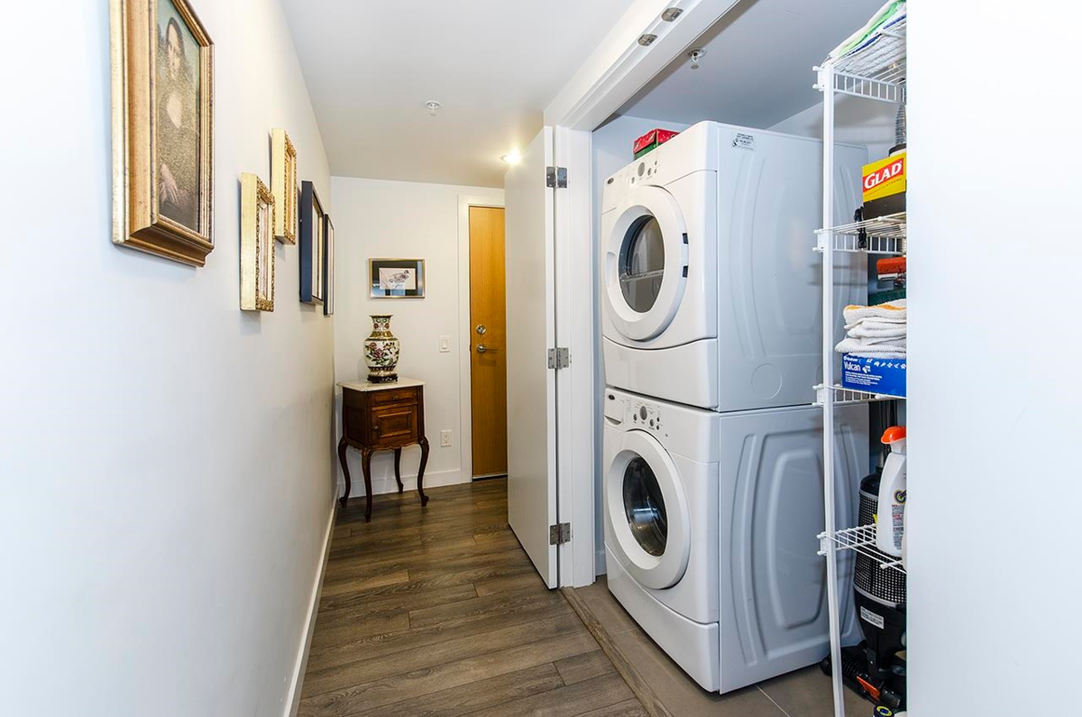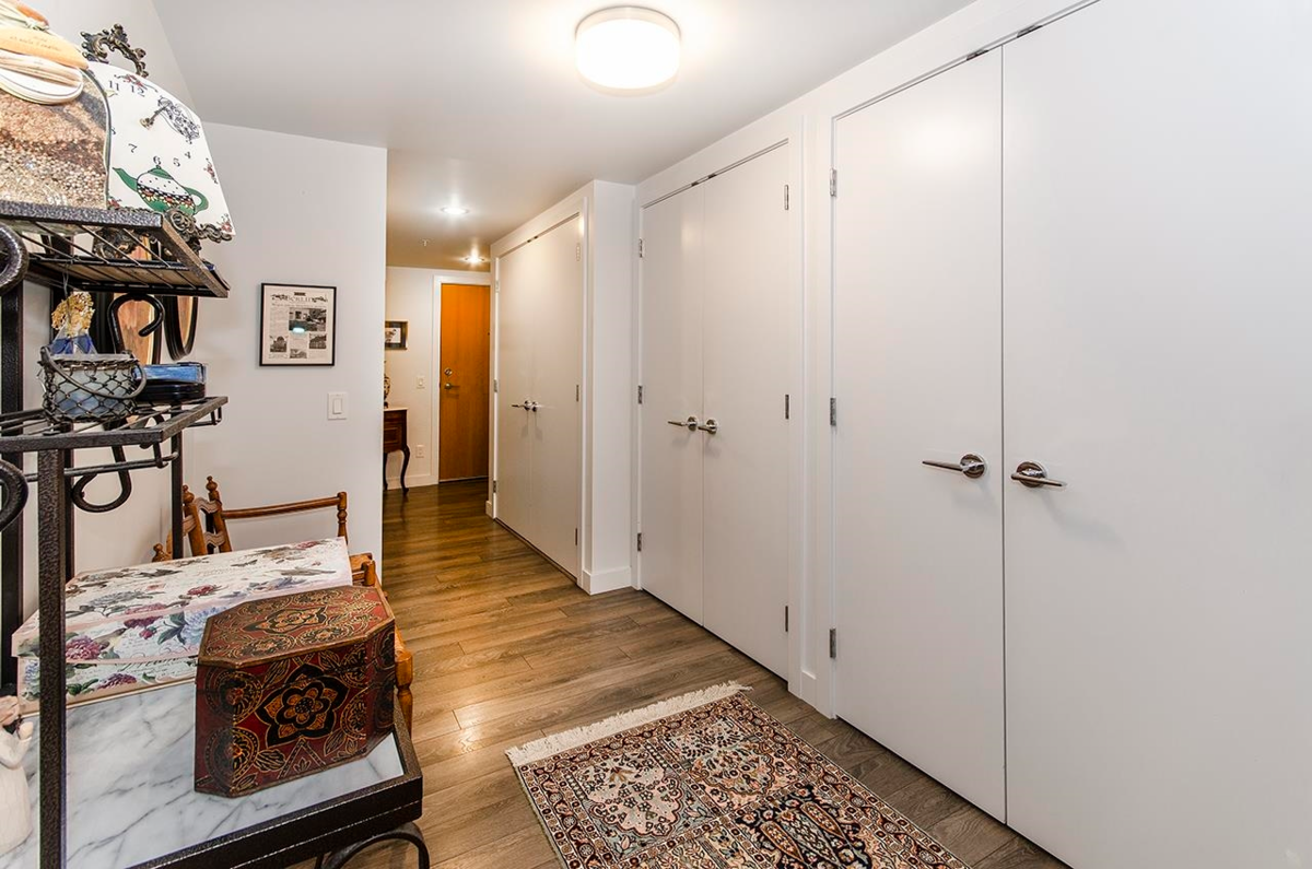 Blissfully private, impressively bright, wonderfully spacious. Built to Leed standards with in-floor hydronic radiant heat, this corner unit features south-west exposure and an open floorplan. The colour scheme is neutral and bright with laminate flooring in the living areas, spacious rooms and a 17'2 by 8'1 ft balcony. The gourmet kitchen features s/s appliances, contemporary kitchen cabinets w/frosted glass uppers, soft close mechanisms , and quartz counters in kitchen to match baths. Walk to Shipbuilders Square, The Quay, galleries and restaurants, or take the seabus downtown. Or relax on the rooftop deck by the open fire table and soak up the view of the Harbour and Downtown.