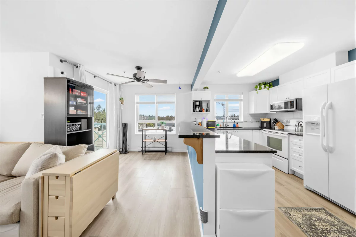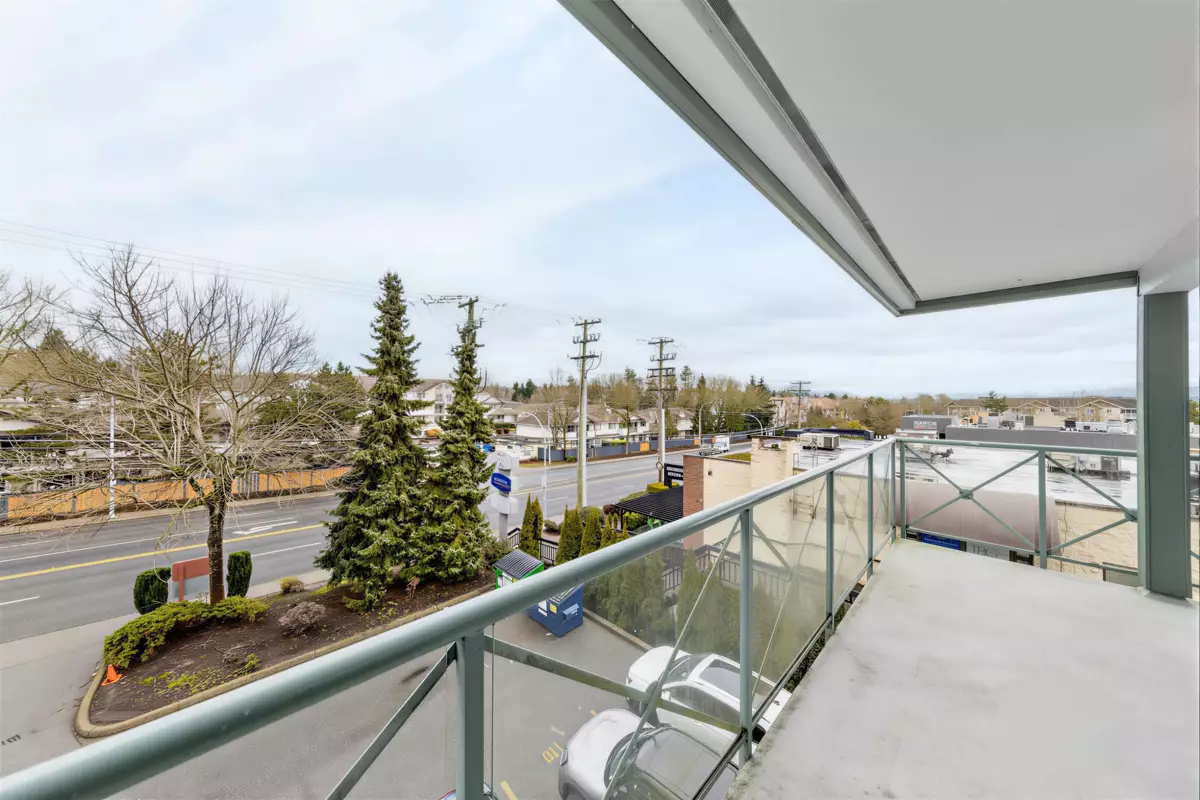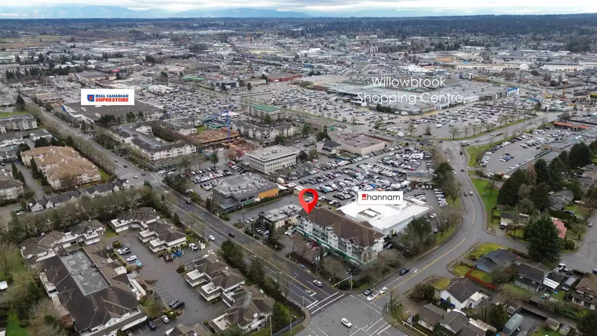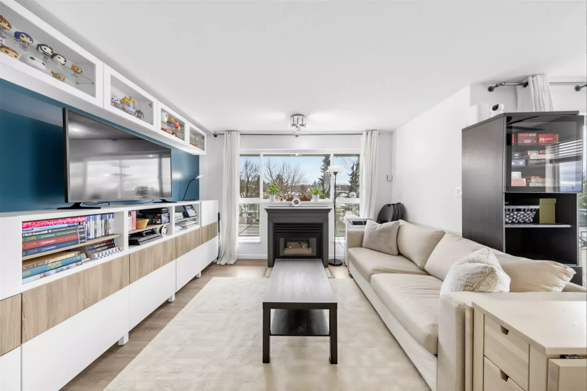 A fantastic opportunity for first-time buyers or investors alike! Welcome to Willowgate—a bright and beautifully 1-bedroom, 744 sq ft home offering comfortable and functional living. This unit features northeast exposure, mountain views, and a spacious L-shaped balcony perfect for relaxing or entertaining. The open-concept kitchen flows seamlessly into the living area, complete with a cozy gas fireplace (gas included in strata fees) and a generously sized bedroom. Includes 1 parking stall. Located in an unbeatable, walkable neighbourhood—just steps to Willowbrook Mall, Superstore, restaurants, and transit, and only a few blocks from the future SkyTrain.