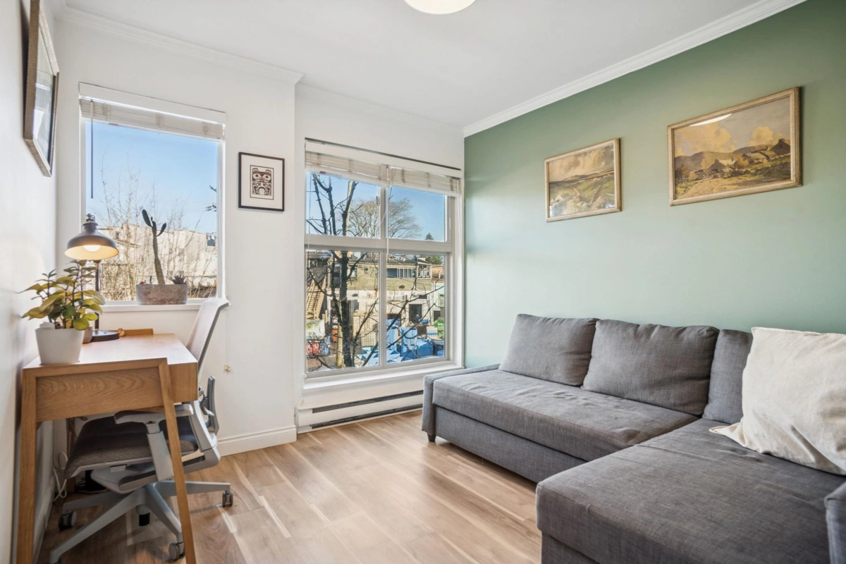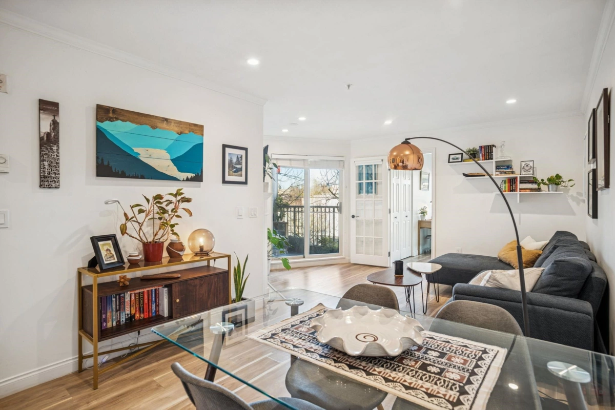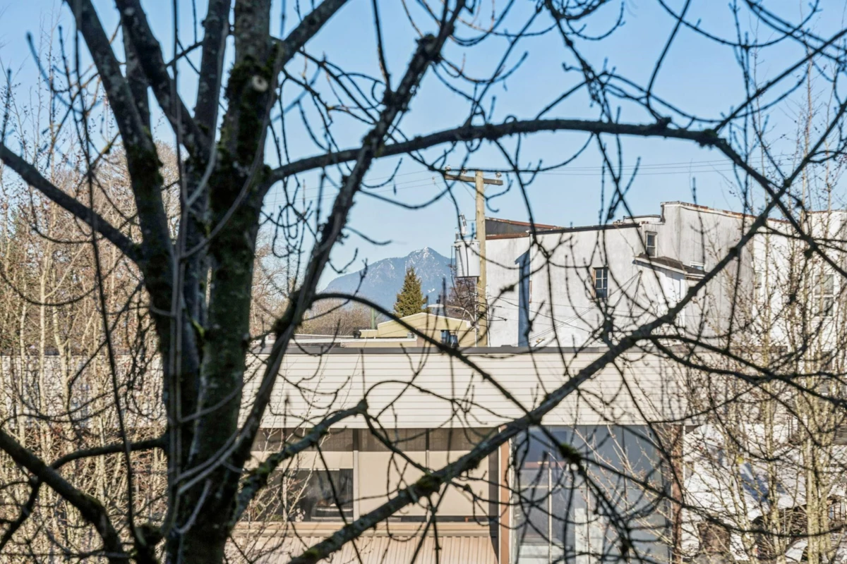Welcome to Vintage Eastside in the heart of Fraser. This beautifully renovated north-facing home offers a quiet, light-filled interior. The kitchen features custom wood cabinetry with soft-close hardware, waterfall quartz countertops, stainless steel appliances with a gas range, and a honeycomb backsplash. Wide-plank vinyl flooring, smooth ceilings, and recessed lighting complete the modern feel. The smart layout offers separated bedrooms, a cozy gas fireplace, bright living space, and generous in-suite storage. Enjoy a private balcony ideal for summer BBQs. Well-maintained, fully rainscreened building with EV charging, bike storage, and a shared garden. Pet-friendly with 1parking stall. Steps to transit and walkable to Mount Pleasant's "Golden Trainagle"(Savio Volpe, Matchstick & more).