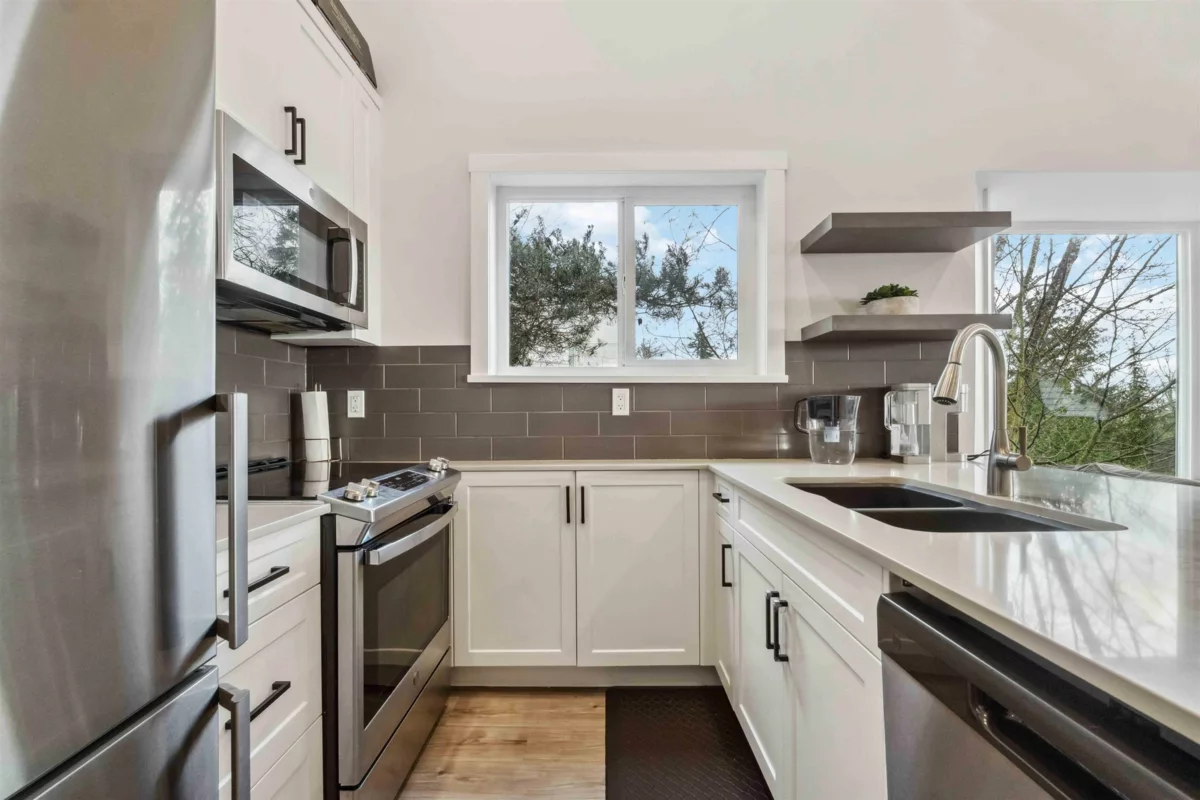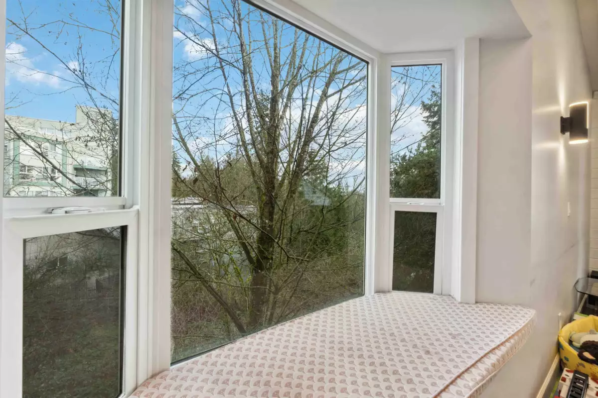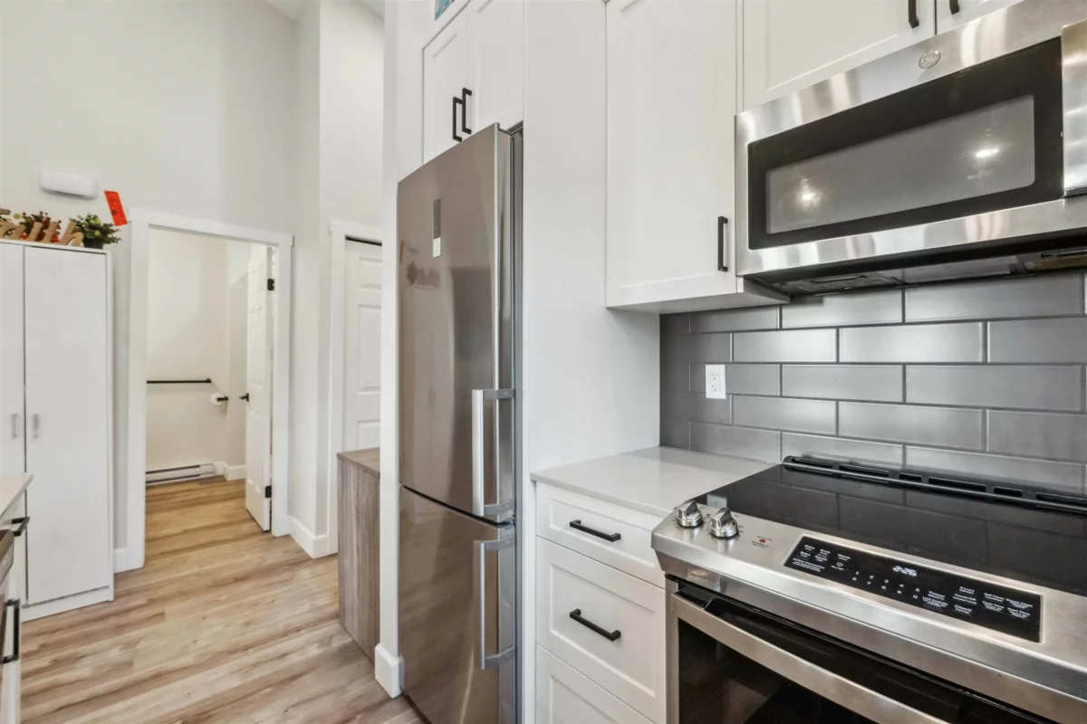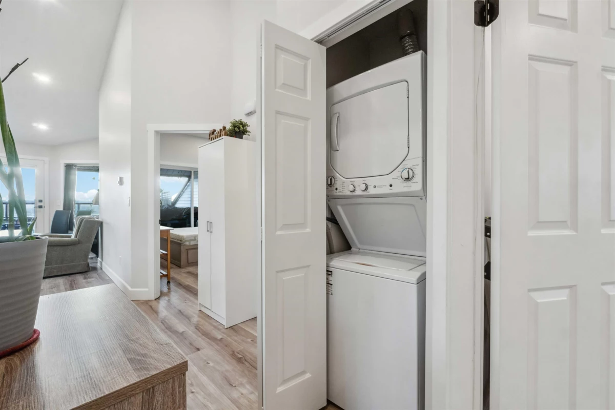 Professionally remodeled in 2022, this beautifully updated 2-bedroom, 2-bath top-floor townhouse offers turnkey living with style and comfort. Extensive renovations include a new kitchen and bathrooms, updated flooring, heating, lighting, appliances, fresh paint, and more. Enjoy a spacious south-facing patio with stunning Fraser River views—perfect for relaxing or entertaining. Includes 1 parking stall. Centrally located, close to shops, transit, and amenities. A rare opportunity for a move-in-ready home with amazing views!