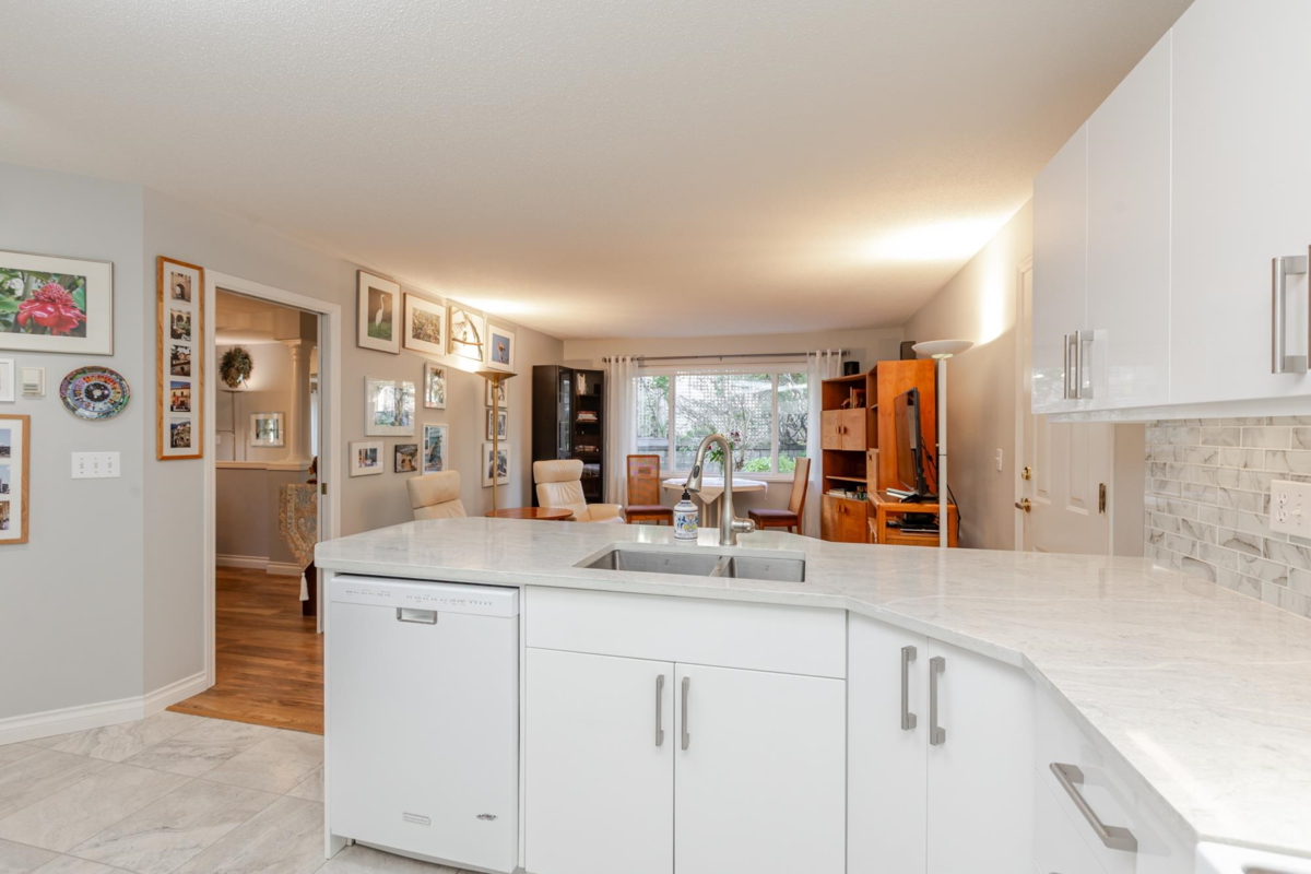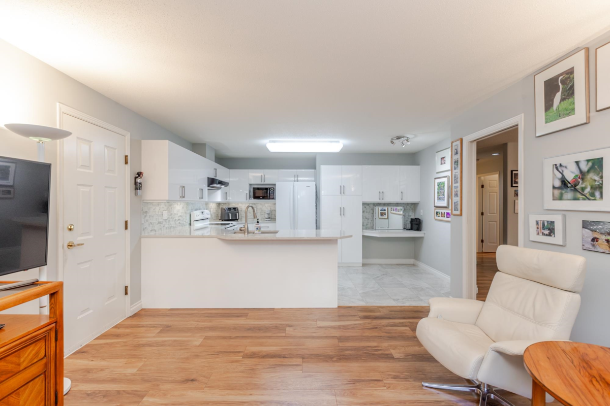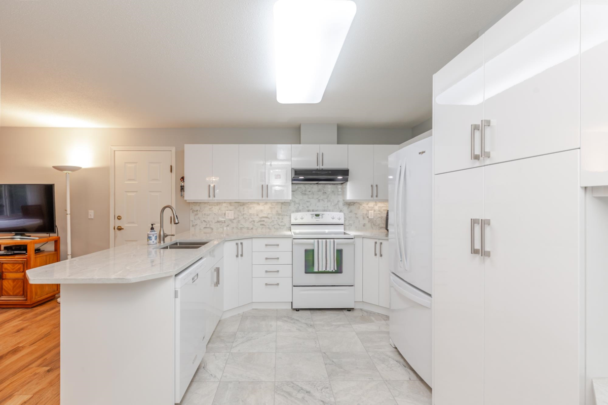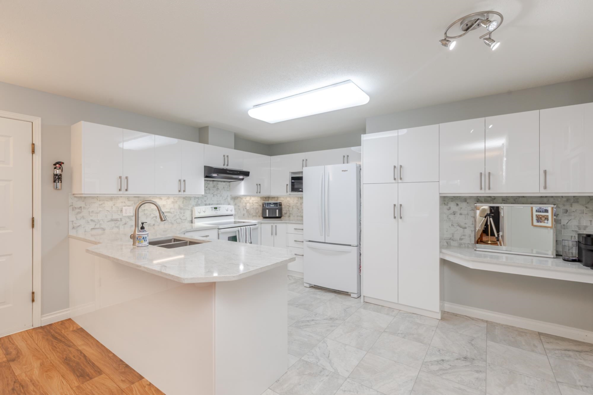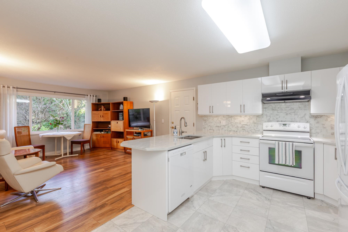 END UNIT! DOUBLE GARAGE! NO STAIRS! over 1550 SQ FT of Light airy living space. NEW WHITE KITCHEN CABINET DOORS,with QUARTZ COUNTERS, NEW TILE, SINK, TAPS,and Armstrong CUSHIONSTEP, HIGH END VINYL FLOORING in KITCHEN, BATHS AND LAUNDRY. BEAUTIFUL "APPALACHIAN HEMLOCK" LAMINATE FLOORING,in the MAIN AREAS, NEWER PAINTING and BLINDS.HOT WATER ON DEMAND, ECO KING COMBI BOILER in 2023."3" ZONE IN FLOOR HOT WATER HEATING KEEPS YOUR FEET WARM IN WINTER, and COOL IN THE SUMMER. 2 HUGE BEDROOMS, 2 FULL BATHS,FORMAL LIVING AND DININGROOMS OVERLOOKING GREEN SPACE a QUICK 2 SECOND WALK TO THE CLUBHOUSE, LUXURY LIVING at an AFFORDABLE PRICE! POOL,HOTTUB, GYM,PUB, PARTY ROOMS, 3 GUEST SUITES, RV PARKING FOR YOUR TOYS. Age restriction one owner must be 55+, 2 dogs or cats, 15" high at the shoulder.