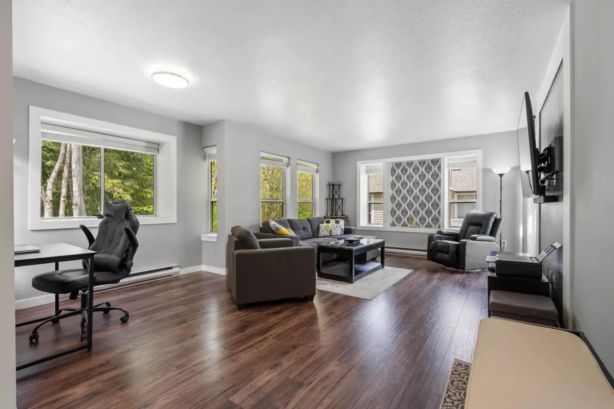 Welcome to The Alderglen, one of Abbotsford’s best family-friendly townhome complexes! This 2 bedroom, upper-level corner home is ideally located next to greenspace for a quiet, calming view. The ample windows bathe the open concept kitchen/living/dining areas in natural light. New paint, upgraded LED lighting & updated kitchen cabinets/counters/flooring give the home a fresh feel. The laundry room & pantry off the kitchen provides plenty of storage. The WIC connects the remodeled bath to the spacious primary bedroom. Enjoy sunsets on the extra-large deck or stroll to nearby parks on this quiet cul-de-sac. Centrally located with easy freeway access make this a commuters dream! Take advantage of the proximity to Shopping, UFV, Hospital and more! Pets allowed make this a unique opportunity.