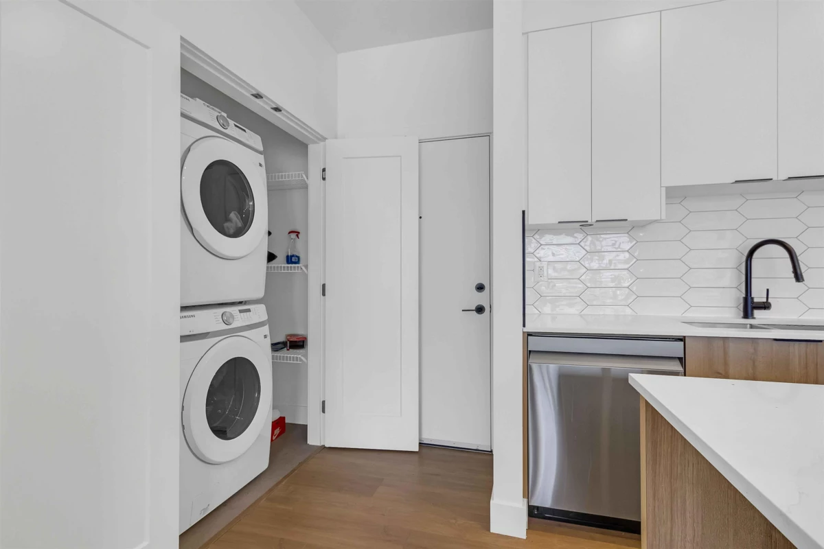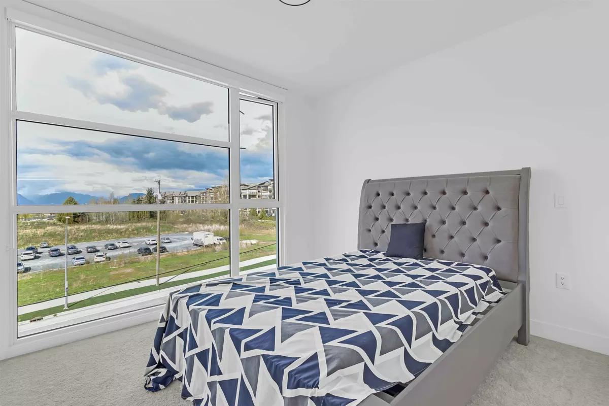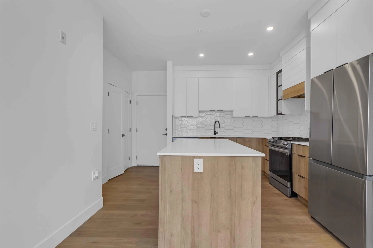 The Ellery. Bright 2-bedroom, 2-bathroom, 3rd-floor unit in Langley's desirable Willoughby neighborhood. Vaulted ceilings and a custom-designed floor plan create a efficient and spacious environment. The kitchen boasts quartz countertops to entertain friends & family, designer tiles & backsplash, a gas range & wide plank flooring. Underground secured parking, storage and bike locker. Enjoy incredible views with communal gardens, picnic benches, lounge chairs, a children's play area and a rooftop patio. It is situated in a central location, offering easy access to all amenities & walking distance to shopping, restaurants, cafes, and more. Heat pump for year-round comfort. Pets and rentals are allowed. Parking #6 P2 and two Lockers #6 & #15.
