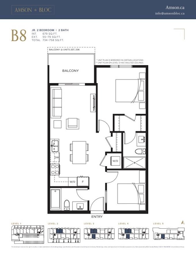 Welcome to Amson Bloc in Panorama Ridge, Surrey — construction is well underway! Offering the rare opportunity to secure an almost MOVE-IN-READY home with only 5% deposit. This thoughtfully designed Jr. 2 bed 2 bath residence features 9 ft ceilings, Bosch cooking appliances with GAS cooktop range, Samsung fridge & laundry, heat-pump dryer, and a full heat-pump system with heating & air-conditioning for year-round comfort. Bathrooms are finished with Kohler fixtures and spa-inspired tilework, while custom closet organizers and premium interior finishes deliver over $20,000 in upgrades included. Located on a quiet street in prestigious Panorama Ridge, just steps from transit, Panorama Village shopping, the YMCA, parks, and schools.