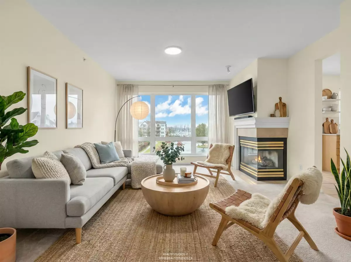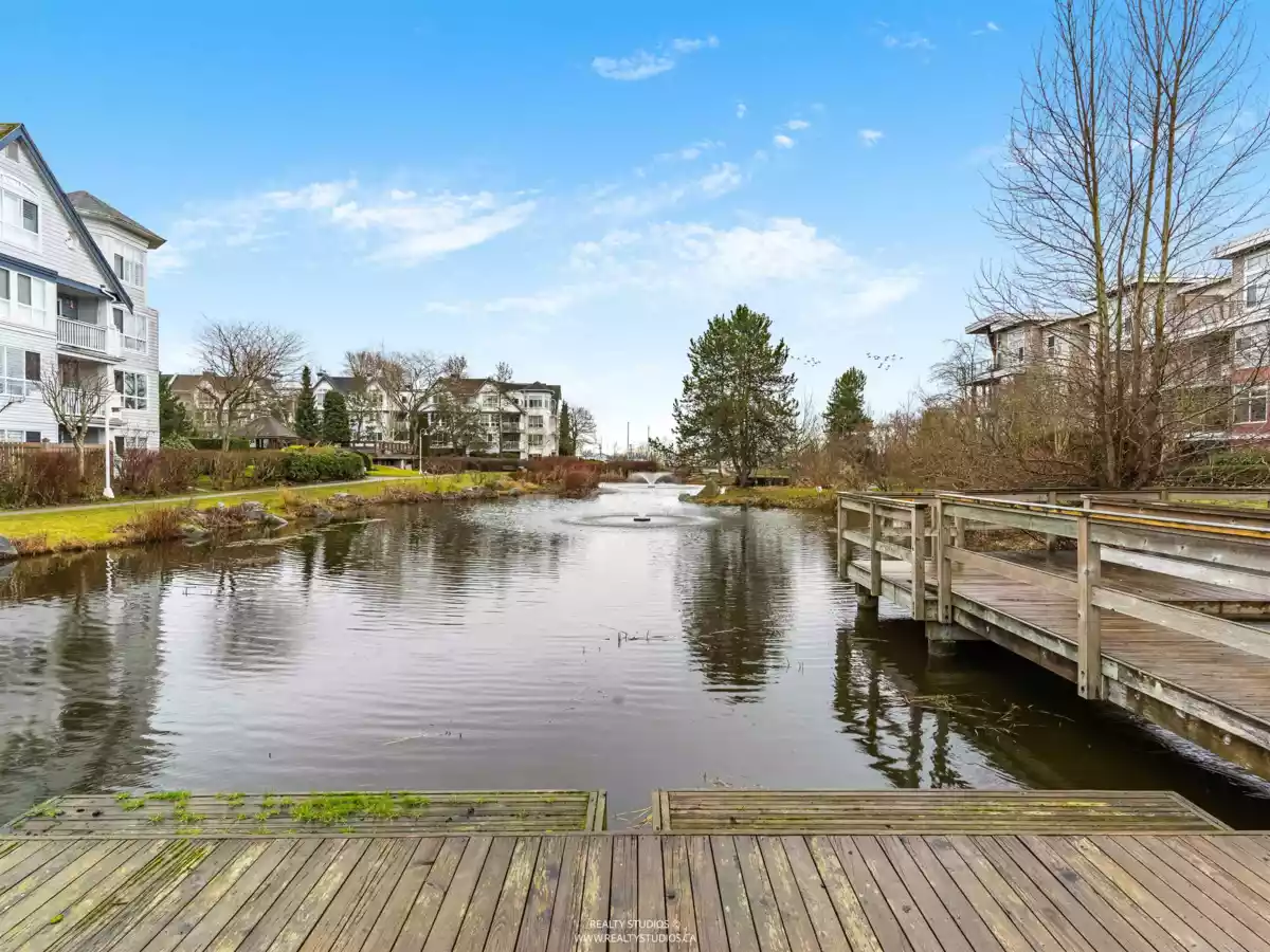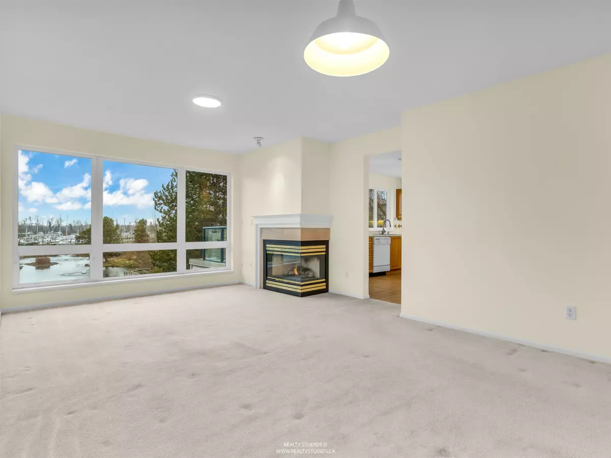 Spacious CORNER UNIT with the BEST VIEWS IN STEVESTON -- overlooking a serene pond, landscaped courtyard, and the Fraser River from EVERY WINDOW! With room for house-sized furniture, this unit is in pristine original condition, offering modernized lighting and a fresh coat of paint. Snuggle up next to the cozy gas fireplace, and enjoy the convenience of in-floor radiant heat -- both included in the strata fees. Unit offers easy elevator and stairwell access, in this well-managed, rainscreened building with guest suites, a new roof, updated common areas, and modernized elevators. Steps to the boardwalk, dyke trail, shops, cafés (including Diplomat Bakery), and restaurants in Steveston Village. Two parking stalls included!