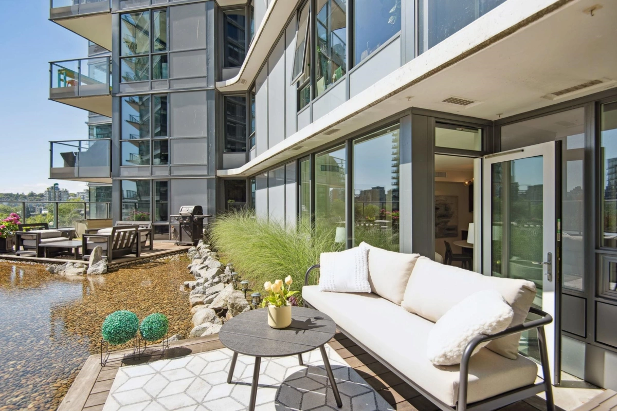 Welcome to your resort-like oasis! This highly sought-after One Pacific gem is a rare find—a southeast-facing 1 bed + den with an elegant open floor plan that bathes the home in natural light through expansive windows. Step outside to your 140 SQFT outdoor living space, offering breathtaking views of beautiful False Creek! The kitchen is a culinary dream, featuring integrated top-of-the-line appliances, sleek quartz countertops, sophisticated wood veneer cabinets, and a luxurious marble backsplash. This meticulously maintained building boasts stunning amenities, including an outdoor pool surrounded by serene palm trees, a relaxing hot tub, and much more. Pets and rentals are warmly welcomed, and a storage locker is included for your convenience. OPEN HOUSE SAT 20TH 2-4PM