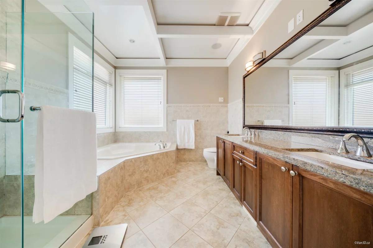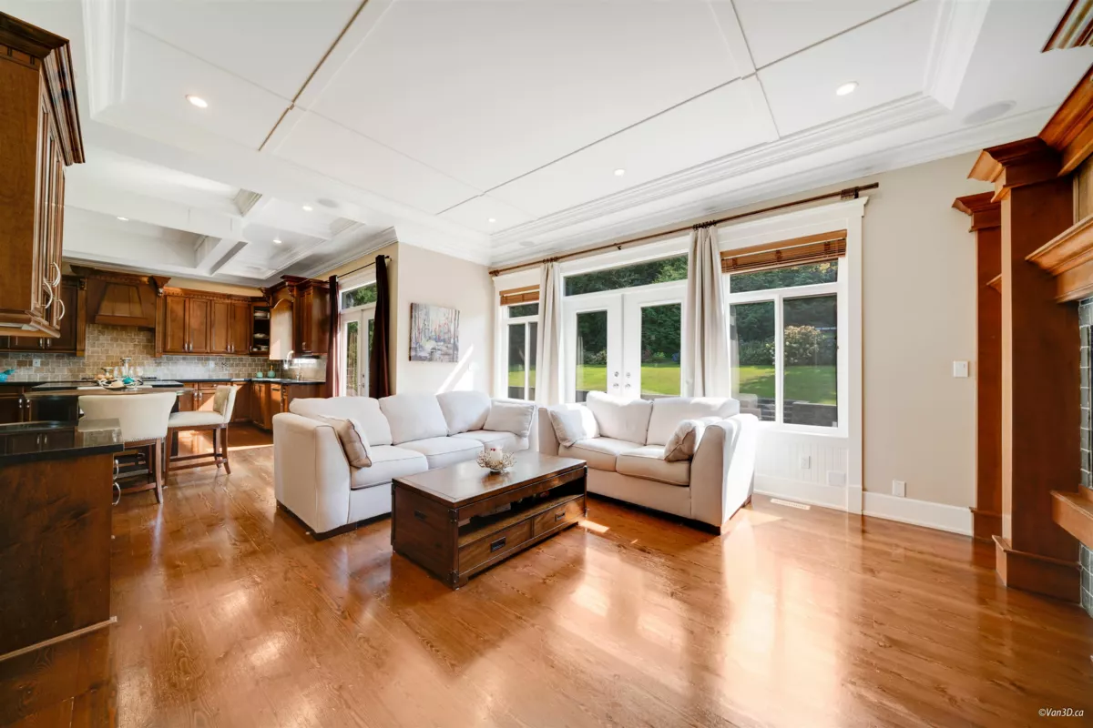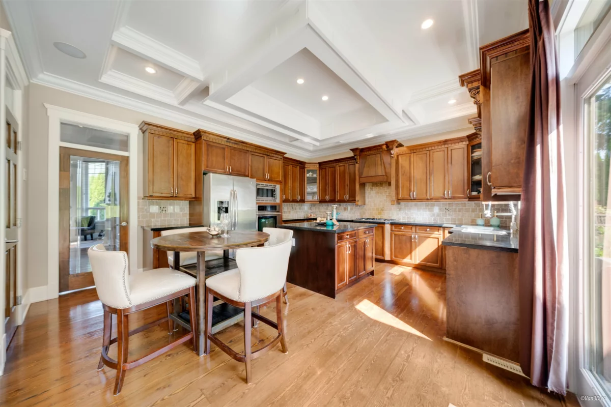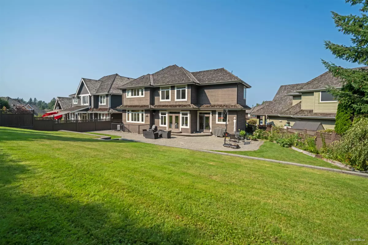 Nestled in a quiet cul-de-sac, this stunning home sits on a massive 11,717sqft lot with a beautifully landscaped, south-facing backyard. Quality built with an exceptional layout, it boasts 10-ft ceilings on the main floor and 14-ft vaulted ceilings in the living room, complemented by classic 7-inch wide plank flooring. The gourmet kitchen features granite countertops, high-end stainless steel appliances, and a built-in pantry. Offering two master bedrooms—one conveniently located on the main floor—all upstairs bedrooms come complete with walk-in closets and ensuites. Enjoy premium amenities including a games room, media room, gym, home sound system, and full house A/C. Located in a highly desirable South Surrey neighborhood, close to Southridge private school, shopping, recreation