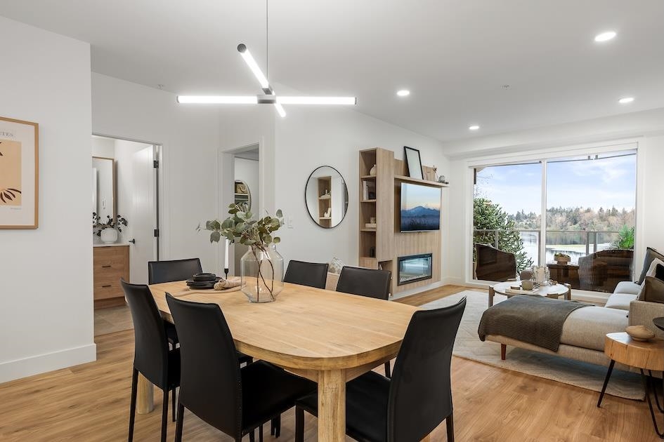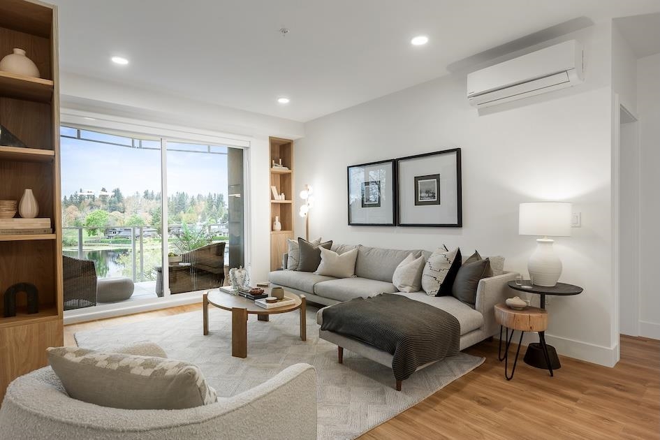 ELEVATED LAKE FRONT LIVING ON MILL LAKE! It is a rare opportunity to live on the shores of Mill lake, minutes away from Abbotsford's essential shopping amenities. Built by reputable local Fraser Valley developer and building Heinrichs Developments with over 30 years of experience in creating exceptional homes. This TWO bed THREE bath home offers 1441 sqft of indoor living space & 318 sqft of outdoor space with views of Mt Baker. This home features AC, a stylish modern kitchen with quartz countertops and Bosch appliances as well as a spacious, custom walk in pantry. Elegant finishes throughout and a collection of optional features will heighten your living experience even more. Move in ready! Book your preview today!