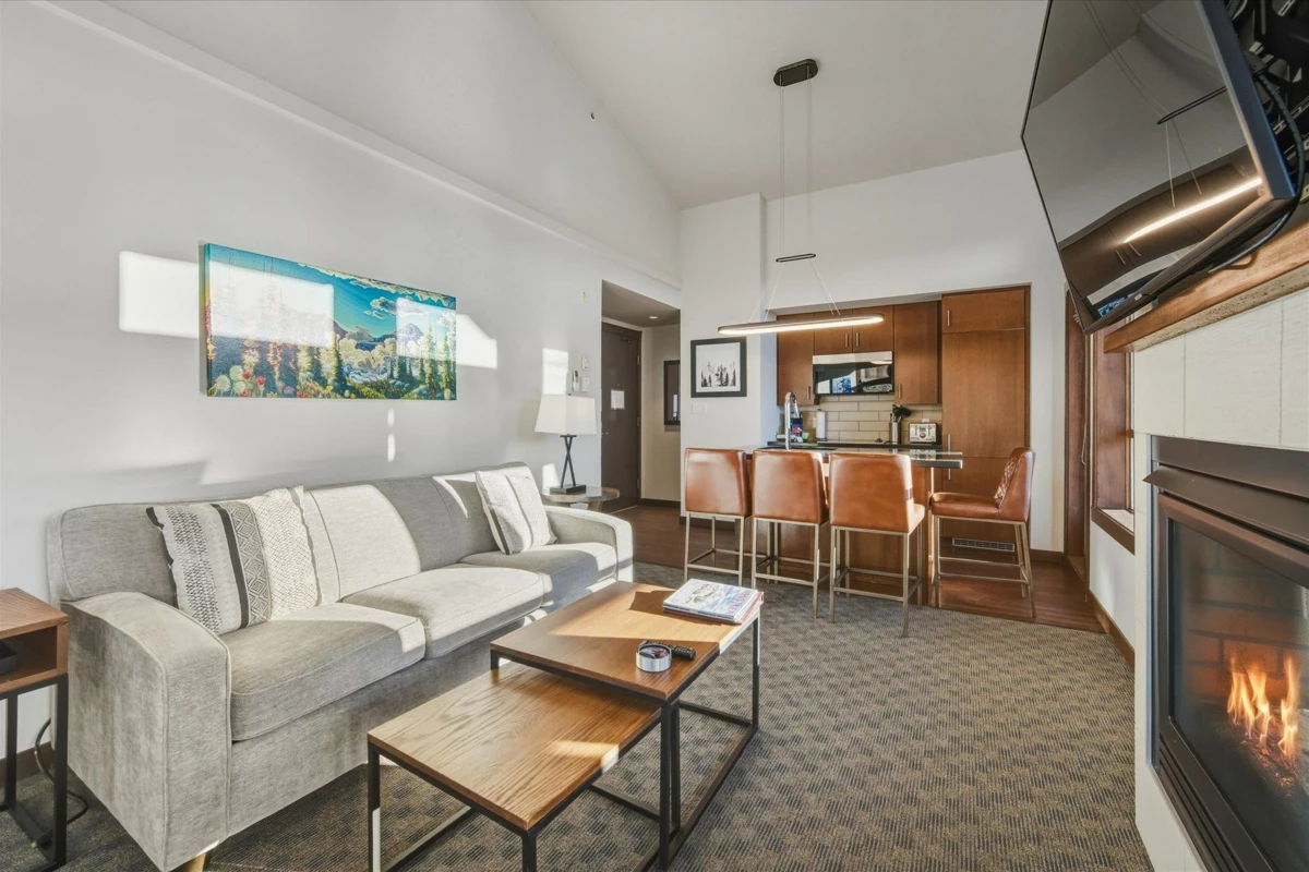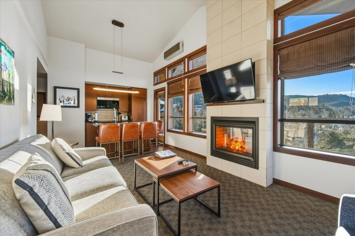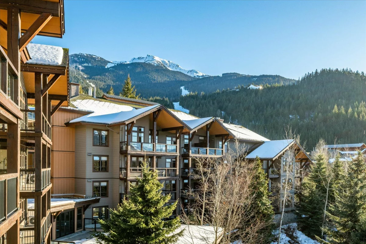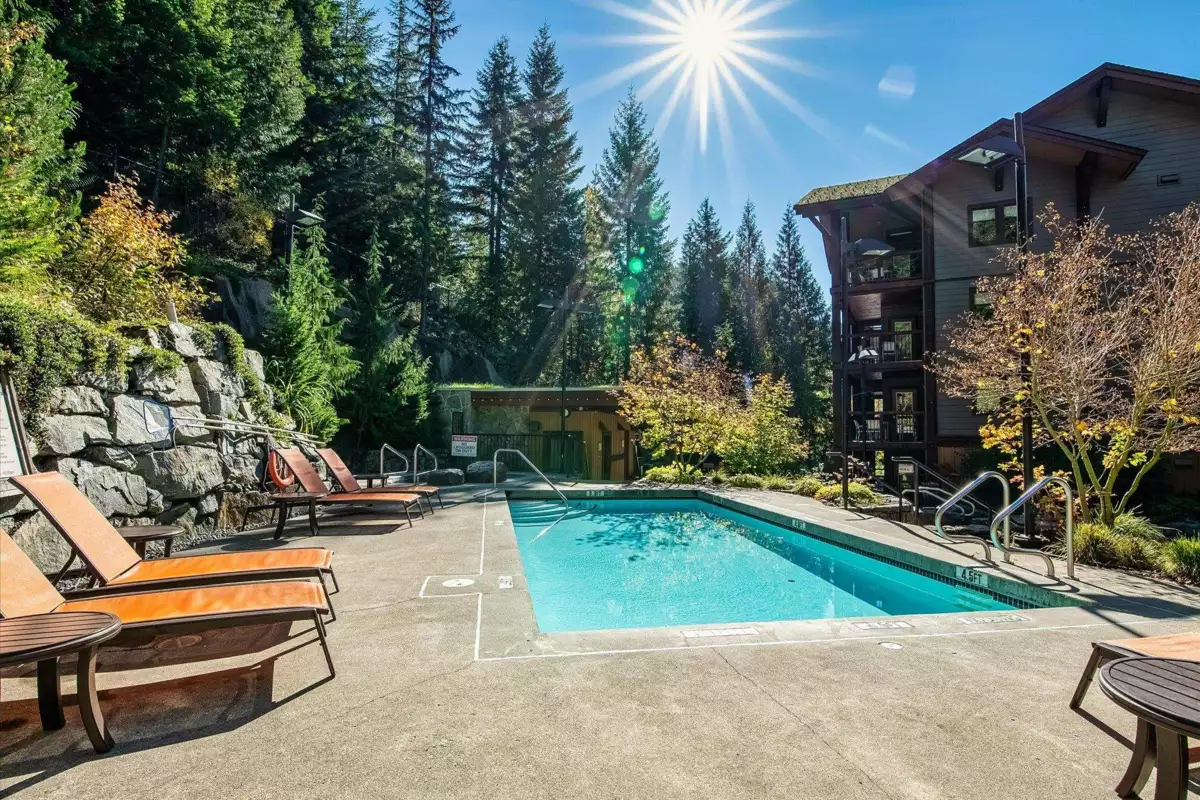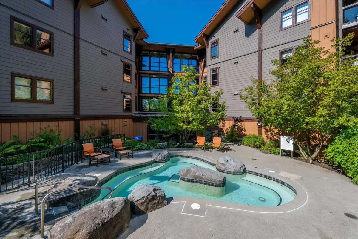 Rare, bright 1 BR end-unit quarter-share at Evolution, offering soaring vaulted ceiling and windows on two sides with views of the mountains and sunsets. Unit 308 is the only 1 BR with this unique floor plan/vaulted ceiling combination in the complex. Features include a gourmet kitchen with high-end appliances, spa-inspired bathroom, in-suite laundry, and an expansive deck with indoor-outdoor fireplace. Only steps to Creekside Gondola, restaurants and shops, Evolution amenities include a year-round outdoor pool, two hot tubs, sauna and steam room, and exercise/media rooms. Heated parking, ski and bike lockers are also provided. Pets are allowed, unique among Whistler quarter-shares. Affordable freehold ownership with unlimited use during quarter-share weeks or collect rental income.