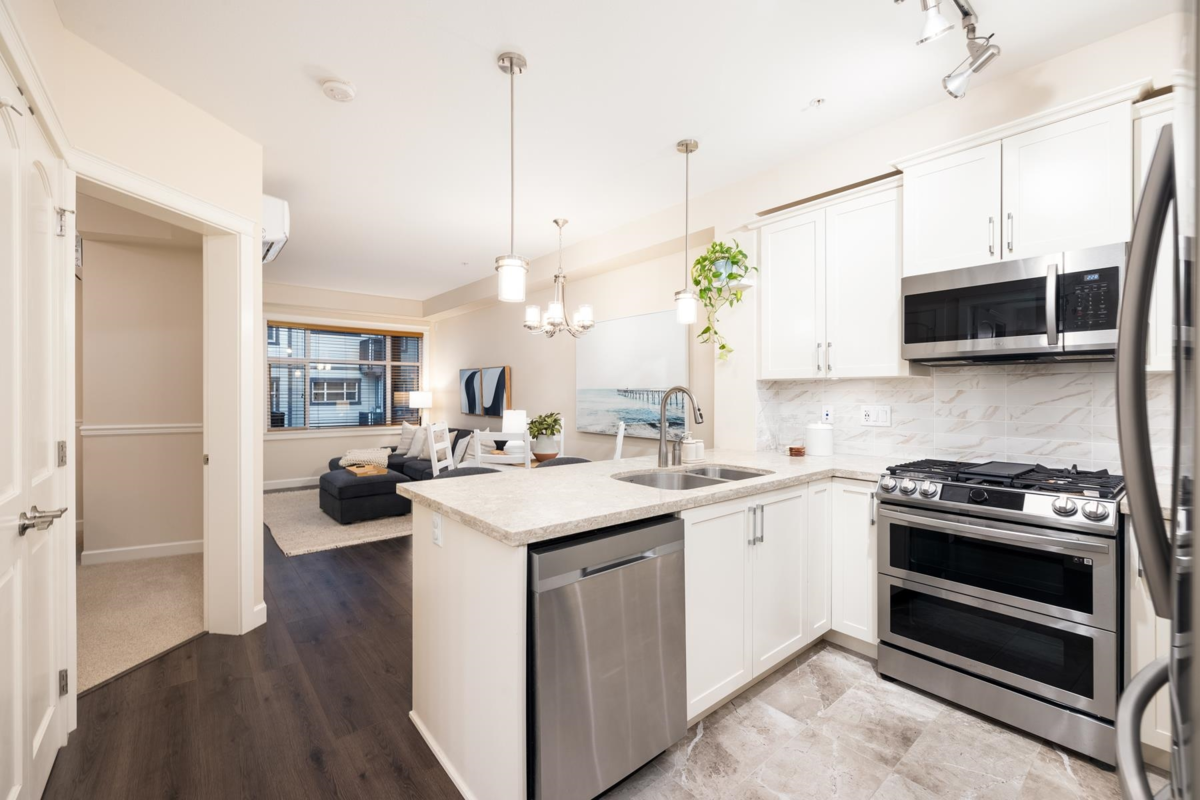 Stunning & immaculate near new 2 Bedroom + Flex/Office + Solarium + Balcony in coveted Yorkson Park on quiet side of the bldg. Spacious chef’s kitch w/high-end S/S appl's incl 5-burner gas range, oversized quartz counters & custom pantry closet. Primary & 2nd bedroom nicely separated by walk thru closet & spa bathroom w/radiant heat floors & double sinks. Bright solarium w/fireplace provides year-round living + private deck w/BBQ hook up. A/C heat pump & soundproofing in all rooms, 2 parking (one EV compatible) beside huge private storage locker. Gym, amenity rm, playground/waterpark, indoor playroom, summer garden deck w/firepit & loungers. Steps to park, restaurants & cafes, walk to Carvolth Exchange, quick access to Hwy1 for a seamless commute.