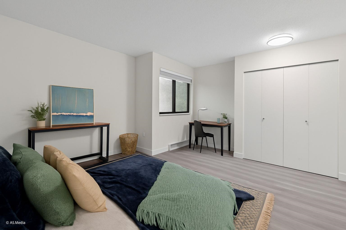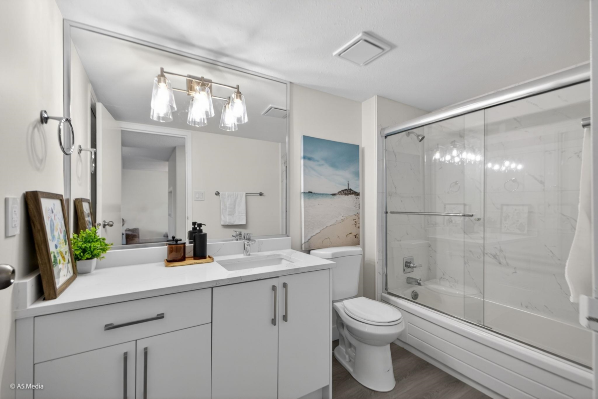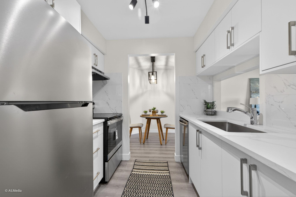 FULLY RENOVATED + MOVE-IN READY! Welcome to Fraser Mews — a beautifully updated 1 bedroom home offering modern finishes, a functional layout, and incredible value. Recent upgrades (2025) include new Kitchen cabinets, Quartz countertops, stainless steel appliances, Flooring, Paint, Lights, and Bathroom finishes. Spacious primary bedroom with shared ensuite, bright living area, and a private balcony perfect for relaxing and entertaining. Located on a quiet cul-de-sac steps to Queen’s Park, Aquatic Center, transit, schools, Royal Square Mall, and SkyTrain. Pet friendly, Low strata fees, 1 secured parking stall. Schedule a viewing that you will love!