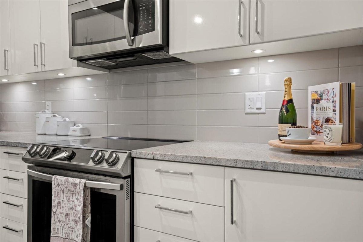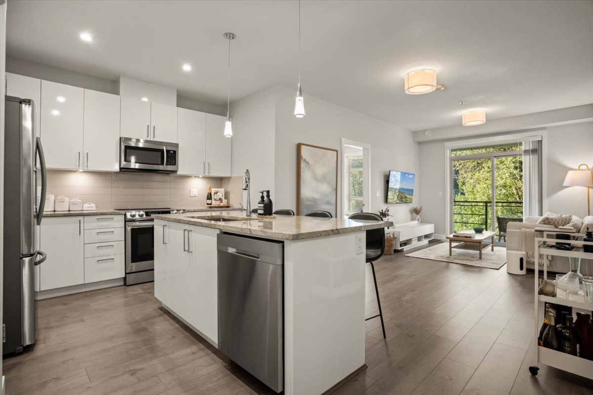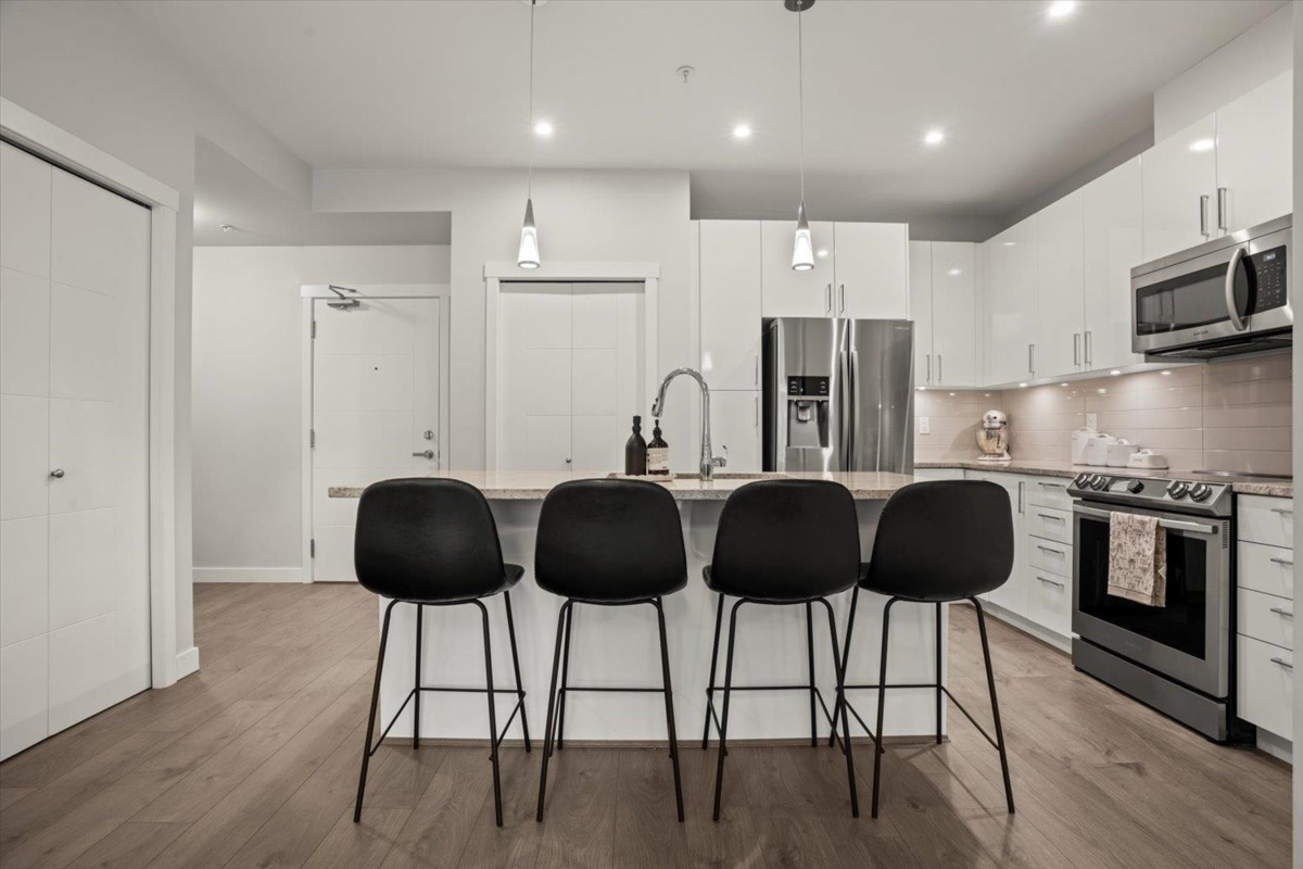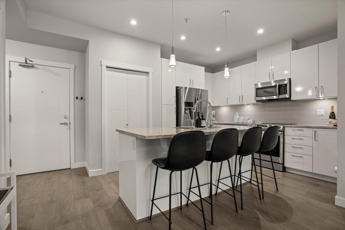 Natural light FILLS this 2 bed / 2 bath condo with SOUTHERN exposure that provides views of the mountains and green tree'd area. The Elliot is a MODERN 2021 building in Chilliwack's Midtown. This unit has an OPEN concept with a luxury kitchen featuring GRANITE countertops, stainless steel appliances, under cabinet lighting and a beautiful island. The primary bedroom is extremely private, filled with more natural light, a GRAND ensuite with dual vanity sinks, and walk-in closet. The building itself has a spacious rooftop patio for socializing and gatherings, underground parking and a storage locker for the unit. 2 Pets are allowed with no size restrictions. Call today for more information and to book a private viewing!