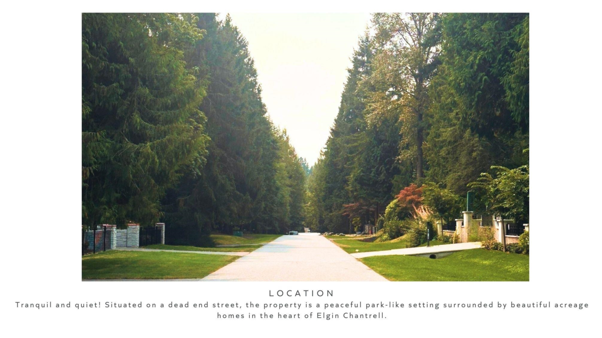 Flat, private one-acre estate property in prestigious Elgin Chantrell, set on a quiet cul-de-sac, surrounded by established luxury homes and mature landscaping. A standout acreage offering at this price point, with exceptional street presence and long-term appeal. Recent professional due diligence includes a BC land survey and ISA Certified arborist report, providing clarity for future planning. The lot’s generous size and configuration allow for a substantial custom residence with outdoor amenities such as a pool, sports court, and coach house. The existing home is livable with some light updating, has been rented in prior years, and presents an excellent opportunity to hold, renovate, or reimagine. Located in the Chantrell Creek school catchment. Acreage prices going up, don't Miss out!