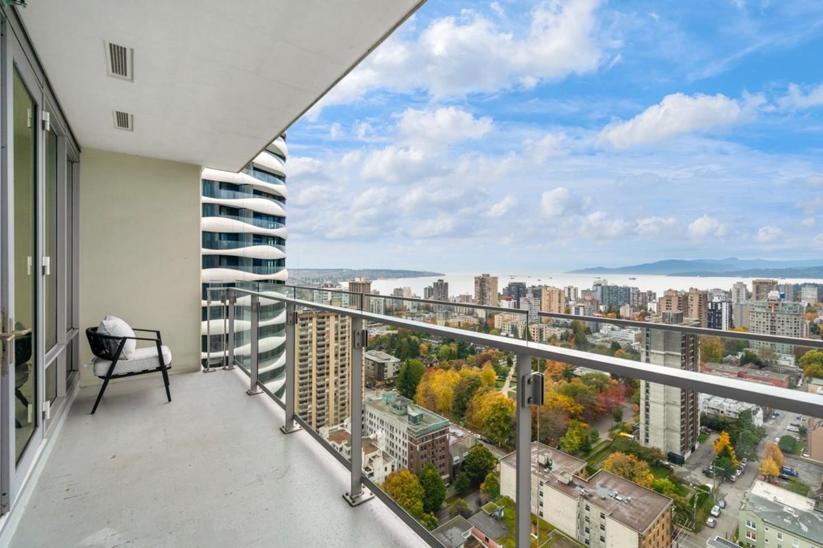 Beautiful home in the prestigious PATINA by Concert Properties, a highly regarded developer known for exceptional quality. This bright 2-bed, 2-bath + den residence offers panoramic views of the ocean, city, UBC, and nearby parks. The thoughtful layout provides excellent privacy with bedrooms located on opposite sides of the unit, while the open living, dining, and kitchen areas are designed to maximize the stunning views with no wasted space. The enclosed den offers flexibility for use as an office or extra storage. Prime downtown West End location with YMCA located downstairs, steps to luxury shopping, the waterfront, restaurants, and entertainment. Features include new paint and new carpet, low maintenance fees, Heating and Cooling system, and timeless modern design. Come view it today!