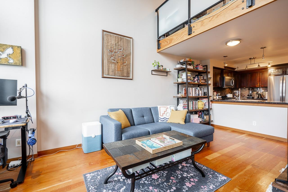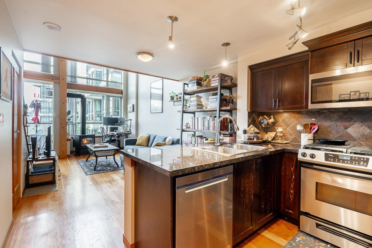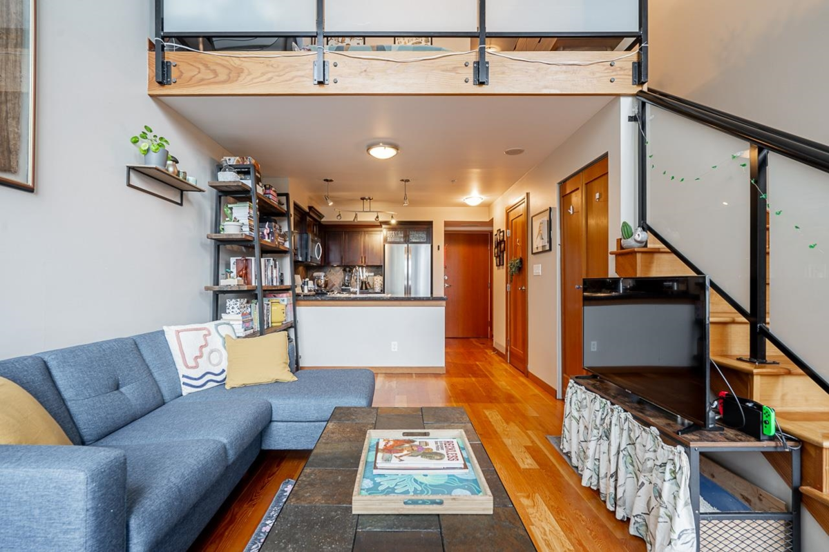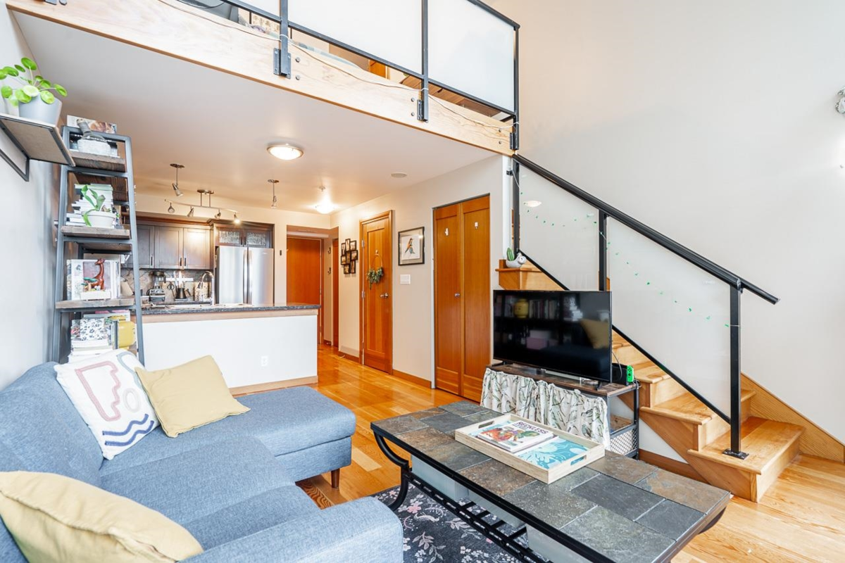 Perfect for the first time buyer or downsizer. This one bedroom loft has a two-piece guest bath on the main floor and four-piece ensuite up, gas fireplace, reclaimed fir floors, insuite laundry. Granite counters, gas cooktop and new fridge and dishwasher in the well designed kitchen. Balcony off the living room offers a peek-a-boo view of the Fraser River. The building has a superb recreation center, bike room, and guest suite. One parking and one locker. The location could not be better; close to Sky Train, transit, shopping, and entertainment. Two pets allowed, no size restriction. NOT ON THE TRAIN TRACK SIDE OF BUILDING, SO VERY QUIET.