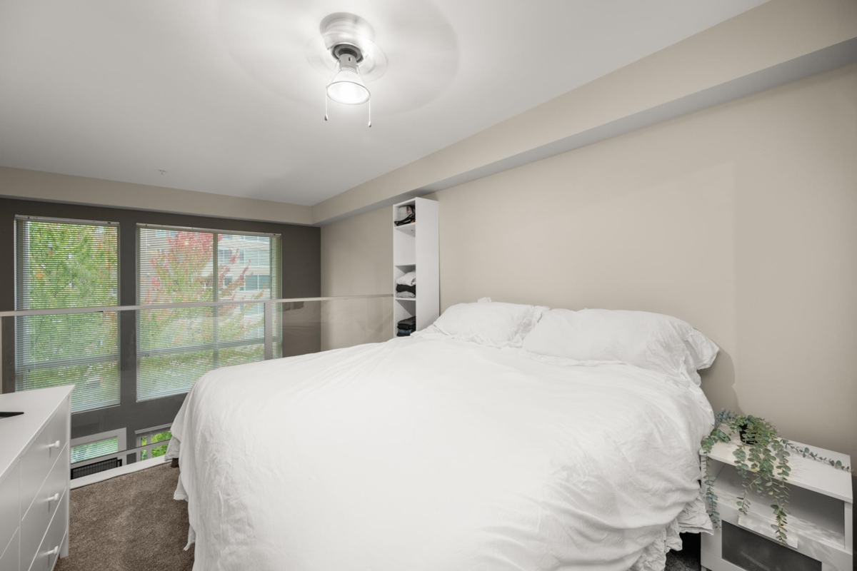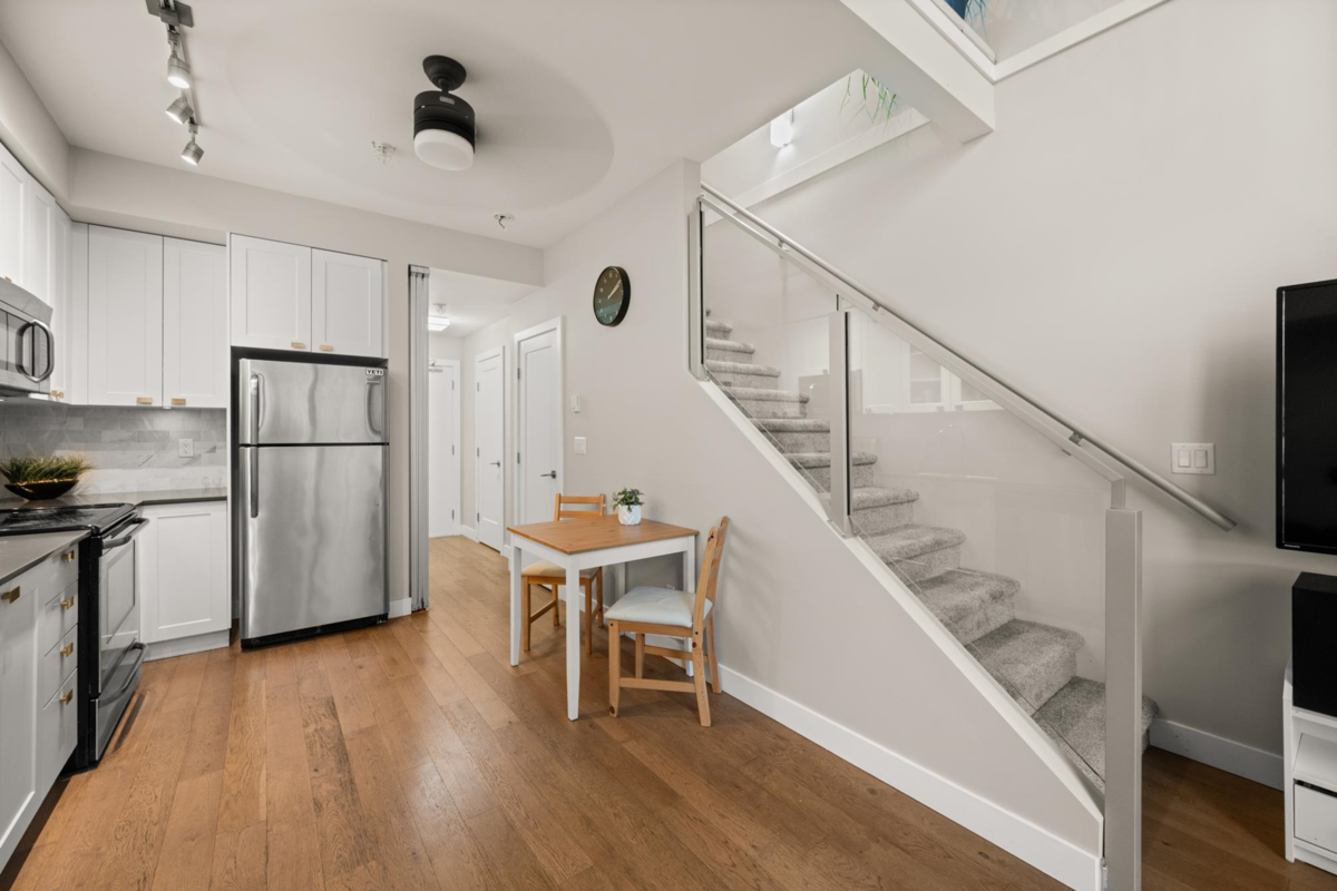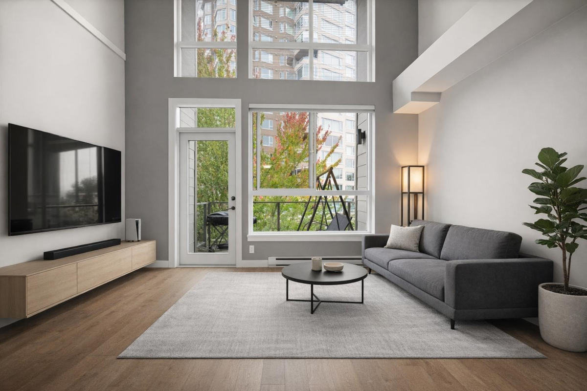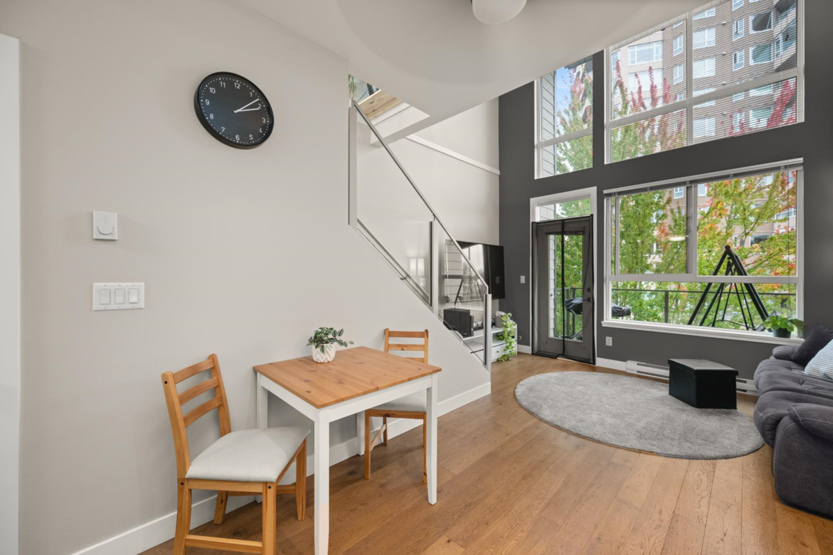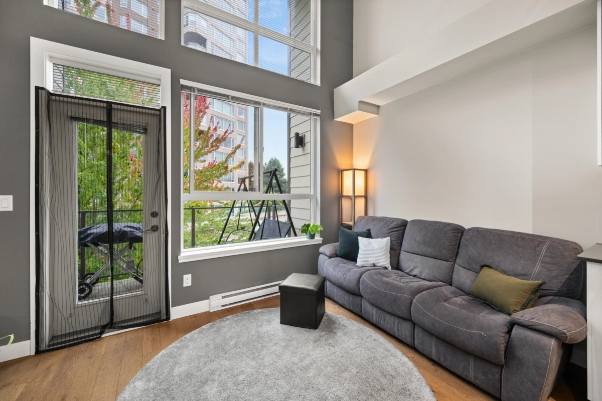 HUDSON'S LOFT in Abbotsford's Central Park Village — where modern design meets community living. This inviting 1 bed + den LOFT offers soaring 18-ft ceilings, stunning north-facing windows, and new flooring upstairs. The open layout blends comfort and style, while the den makes the perfect home office, additional storage or welcoming entryway. You have a conveinent half-bath in the entry and spacious pantry under the stairs. Steps to coffee shops, Trading Post Brewery, Cora's breakfast, every day amenities and trails just steps from your door. Includes 1 parking, 1 storage, and 2 pets allowed, LARGE DOGS & BULLY BREED FRIENDLY! There's even a designated dog park in between the two buildings. Discover your space to live, work, and connect at Hudson’s Loft.
