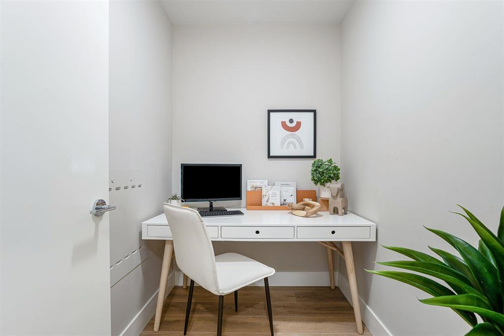 PICTURES ARE AI-GENERATED .STUNNING 1 BED & DEN at AVALON 1 in the vibrant River District community! Stylish westcoast inspired home faces the beautiful quiet courtyard w/water feature. Efficient layout w/high ceilings, radiant heat, laminate flooring & smart details like USB plugs & storage solutions. Your inner chef will love the kitchen w/quartz counters & 5 burner gas range w/convection oven. Large bedrm w/walk in closet connects to a spa like ensuite w/ambient floor lighting & mirrored wall storage. COMPLETE resident amenities inc fitness centre, SkyBar, SkyLounge, garden level party room, multi-purpose & meeting rooms & 2 guest suites. Steps to the riverfront walkways, Save-on-Foods, Shoppers, Starbucks, Sushi Mura, Bosley's, banks & direct bus to Metrotown. 1 Parking & 1 Locker.