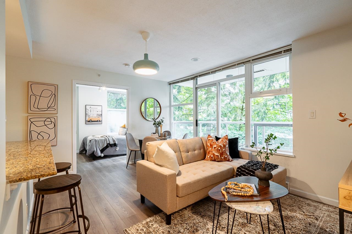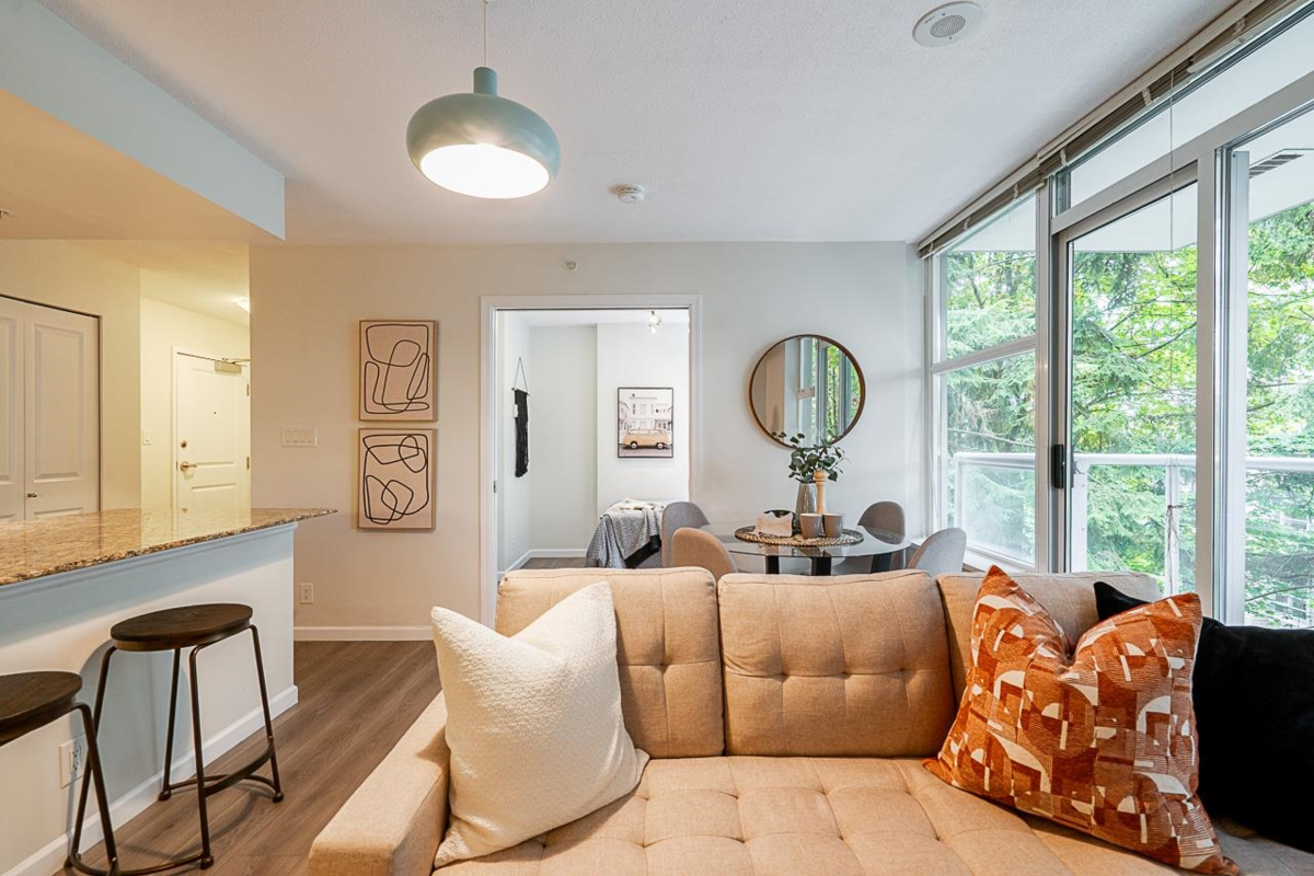 Concrete Building! Surrounded by nature yet steps from SFU, this 2 bdrm home at Novo 2 offers the best of campus-side living. Enjoy a bright 730 sqft layout with split bdrms for privacy and large windows that fill the space with natural light. Recently refreshed with new floors, baseboards & paint, this home feels completely move-in ready — nothing to do but unpack and enjoy. Relax on your private balcony framed by evergreens, or take advantage of the fitness centre and nearby biking and hiking trails. Just minutes to groceries, cafés, transit & SFU amenities, this is an ideal fit for students, first-time buyers or investors seeking a modern, low-maintenance home in a welcoming community.