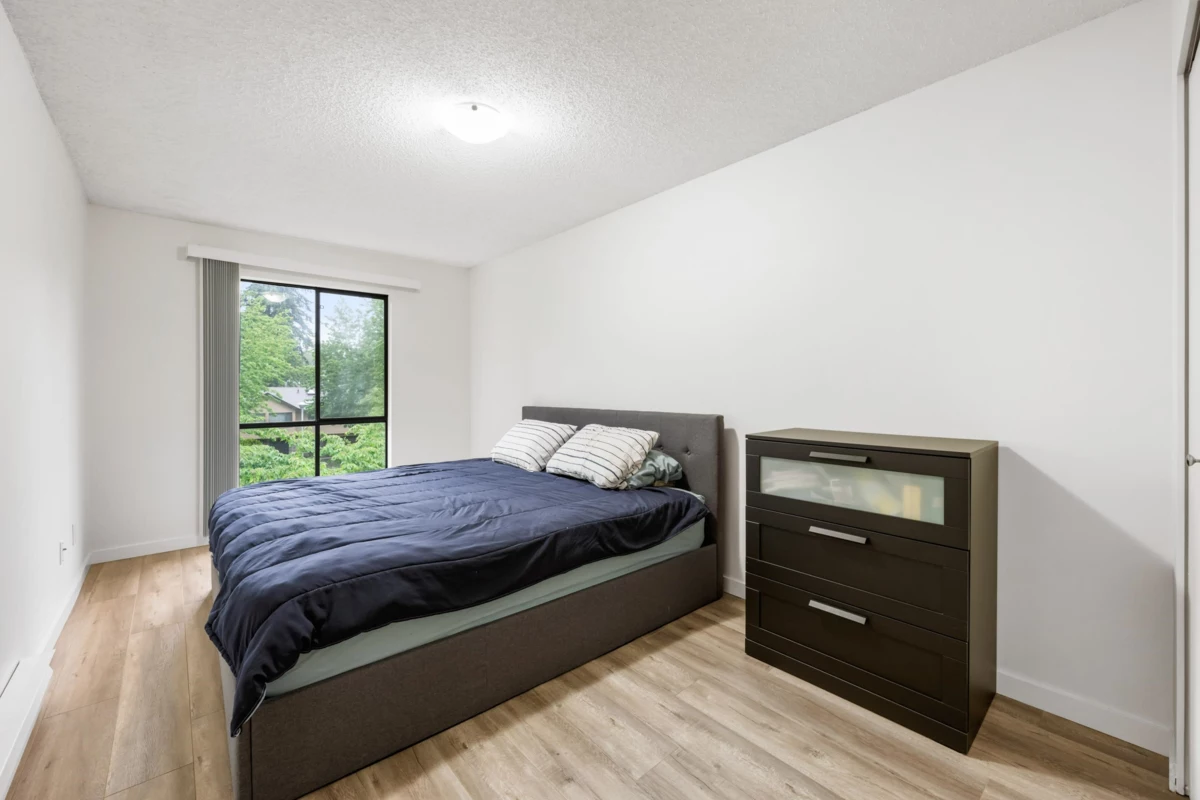 Welcome to this modern, fully renovated top-floor corner unit in a prime Guildford location. This spacious 1-bedroom home boasts a large living room and bedroom, complemented by recent updates including new cabinets, stainless steel appliances, oak laminate flooring, and a stylish bathroom with a new vanity, bathtub, and shower. Enjoy the serene northwest exposure from your private balcony, overlooking trees and a common area. Convenience is at your doorstep, with Guildford Mall, Surrey Central Skytrain, parks, and a recreation center nearby. This unit includes one parking spot, and lockers are available on a first-come, first-served basis. With shared laundry, and pet and rental-friendly policies, this home is perfect for first-time buyers and investors.