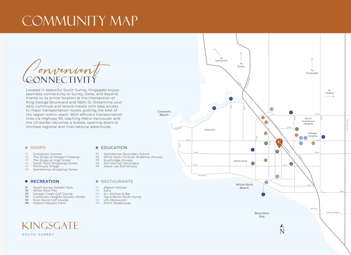Welcome to Kingsgate, South Surrey’s 4-storey building. This bright 2-bed home offers 792 SQFT of thoughtfully designed space, with wide-plank laminate flooring, sleek Fisher&Paykel appliances, quartz countertops & spa-inspired bathroom that feels like a retreat. Unwind on your oversized balcony with a gas BBQ hookup while enjoying the comfort of central heating & cooling year-round. 1 parking & storage & access to resort-style amenities: a fully equipped fitness centre, calming yoga studio, outdoor firepit, & social lounge. A brand-new daycare centre onsite, steps from Safeway, local cafés, schools, Peace Arch Hospital, White Rock Beach, & Hwy 99. Completion Spring 2026. Units are available for preview. 5% Down. Inquire about additional units & floorplans.
