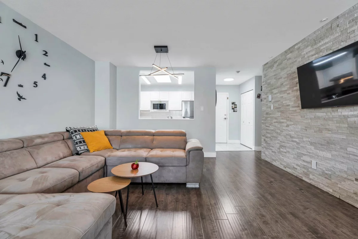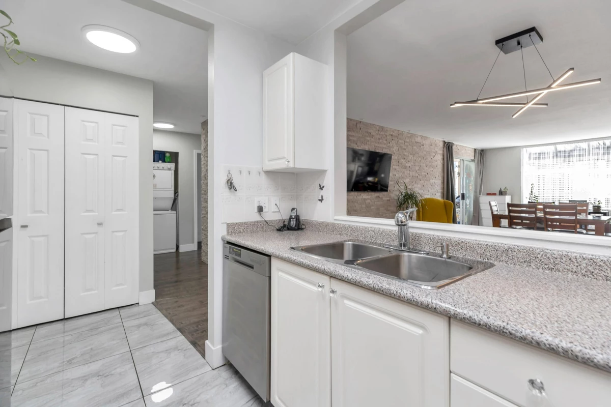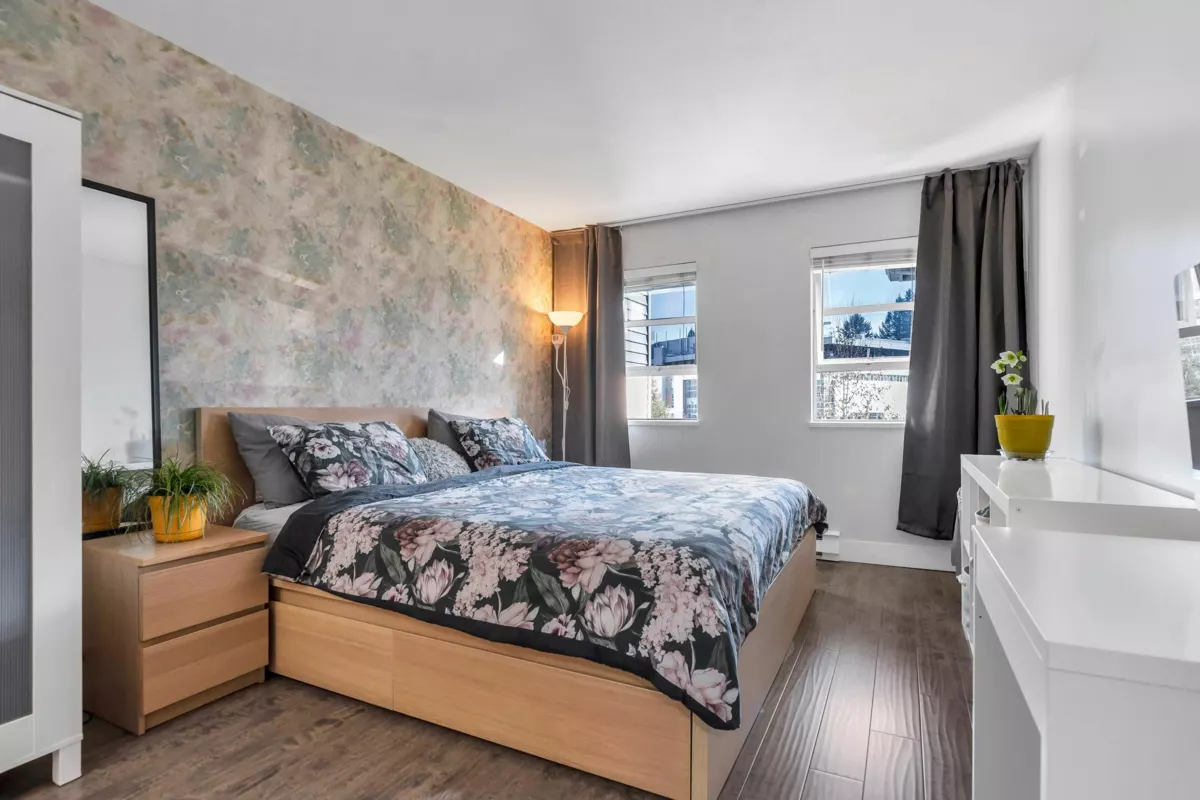 Spacious and bright 2 bedroom, 2 bathroom condo offering 1,066 sq ft of well-designed open-concept living with newer flooring and modern bathrooms. Functional, move-in ready floor plan, in-suite laundry and in-suite storage. Comes with two secure parking stalls. Well-managed and well-maintained building featuring a gym, sauna, wheelchair access, and gas included in the maintenance fee. Pet-friendly (with restrictions). Prime, central location, walkable, close to SkyTrain, hospital, Jim Pattison Outpatient Centre, shopping, cafés, banks, movie theatre, and Green Timbers Urban Park. Excellent value for first-time buyers or a strong investment opportunity.