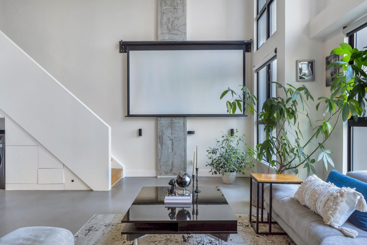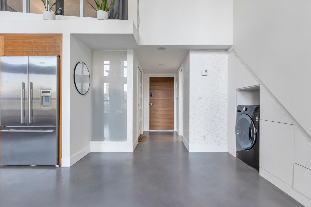 One of One opportunity at The Space Lofts. This floorplan is UNIQUE TO THE BUILDING! Fully renovated with warmth and character, this floorplan offers a 2-bedroom layout and a large kitchen. Dramatic double-height ceilings, polished concrete floors, and exposed concrete feature walls retain the loft's drama while the kitchen warms the space with walnut cabinetry, stone counters, mosaic backsplash, and full-sized appliances. Plenty of natural light from the triple window bank and South exposure. In-suite combined washer/dryer. 1 parking, 2 pets ok.
