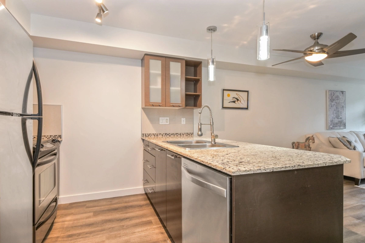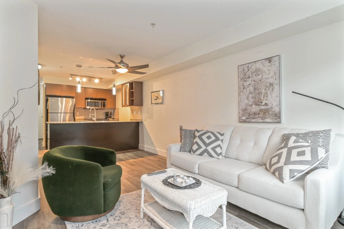 This well-maintained and move-in-ready 1-bedroom plus spacious den condo offers a bright, open-concept layout with a modern kitchen featuring stainless steel appliances, granite countertops, and an extended bar top. The living room is enhanced by a cozy electric fireplace, while the private balcony overlooks the quiet, tree-lined side of the property, creating a peaceful retreat. Located in a pet-friendly and rental-friendly building, the unit includes secure underground parking, a convenient storage locker, and access to a guest suite for visitors. Close to local shops, restaurants, and everyday essentials. With quick access to HWY 1, UFV, Abbotsford Centre, hospital, and public transit, This home combines comfort, convenience, and lifestyle. Don’t miss out—book your showing today!