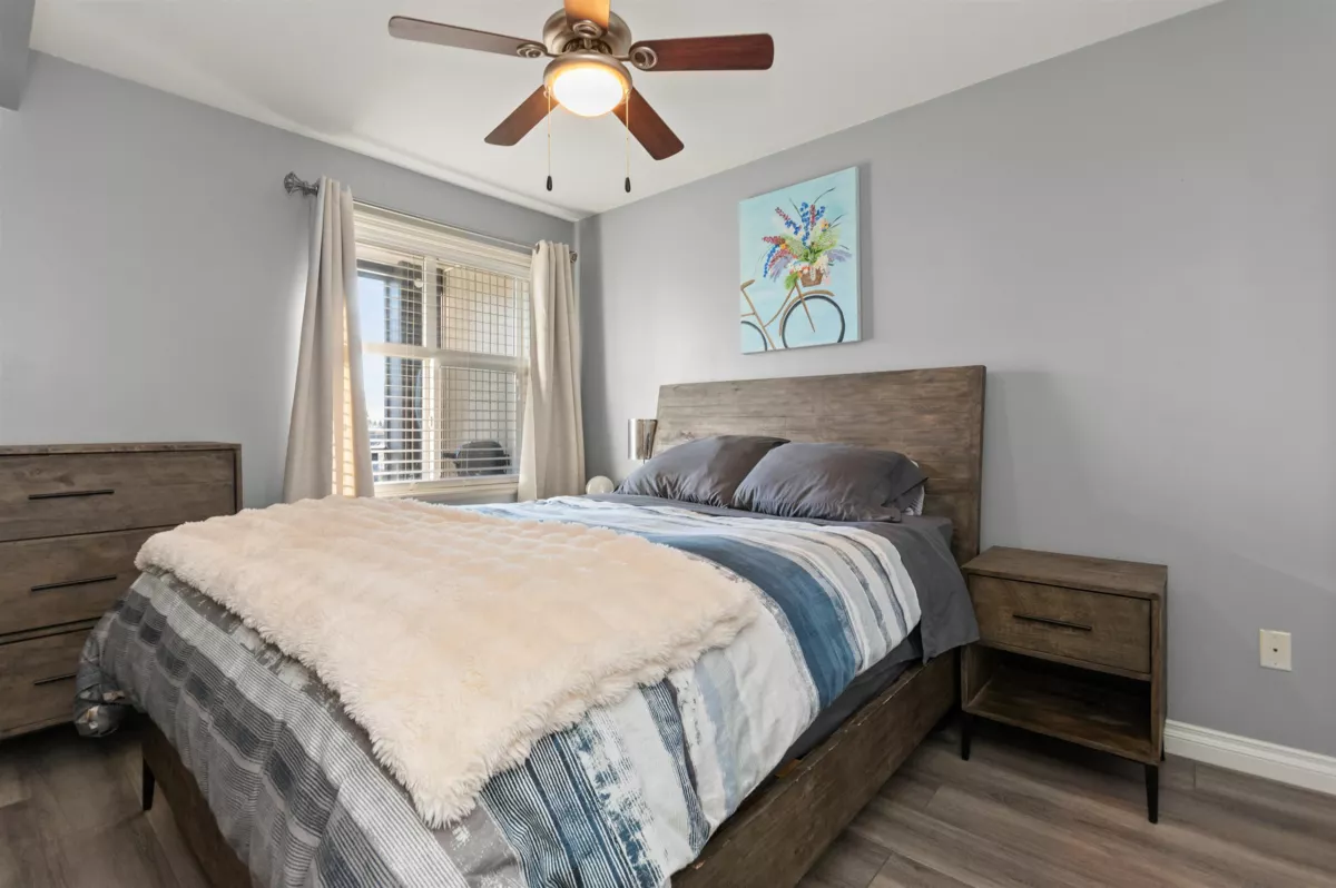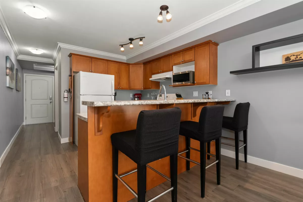 LOCATION, LOCATION! This well-maintained one-bedroom upper unit is ideally situated with shopping, restaurants, and public transit just steps from your door. Located in a welcoming 55+ community, the building offers a variety of amenities including a recreation room with scheduled activities, an exercise room, guest suite, and library. The open-concept kitchen features an eat-up bar and flows nicely into the bright living space. A sunny south-facing exposure fills the home with natural light and provides lovely mountain views from both the living area and patio. A generous storage room adds extra flexibility and could easily be used as storage or a small home office.