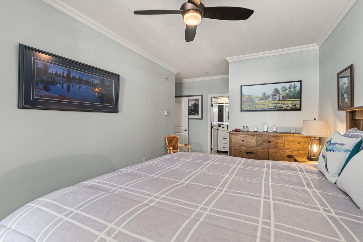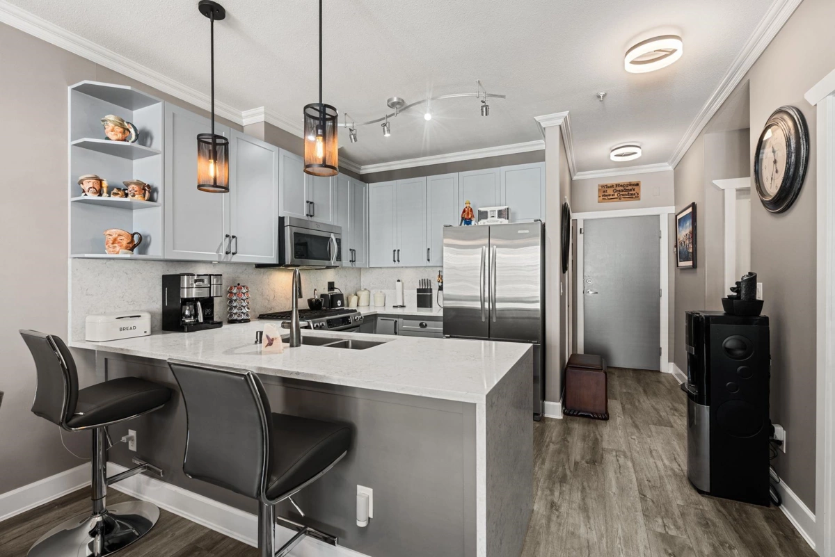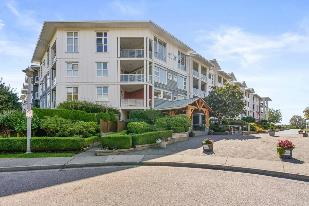 Stunning Coppery Sky Apartment! This gorgeous & spotless 2 bed, 2 bath, den & separate laundry/pantry room has 1,088 sq ft unit w/ updates throughout – BONUS 3 PARKING STALLS! Both bathrooms updated: new floors (heated in ensuite w/ heated mirror & towel rack), tub & shower tile, vanities & fixtures. Step into an open kitchen w/ quartz waterfall counter & matching backsplash, S/S appliances incl French door fridge & gas stove & under cabinet lighting and enjoy engineered flooring throughout w/ carpet in the bedrooms. Updated light fixtures throughout, wide open dining/living space with custom fireplace & quartz surround awaits with an expansive covered balcony with views to the river. Steps to the boardwalk & sunsets, minutes to Steveston Village, & dyke trails beyond.