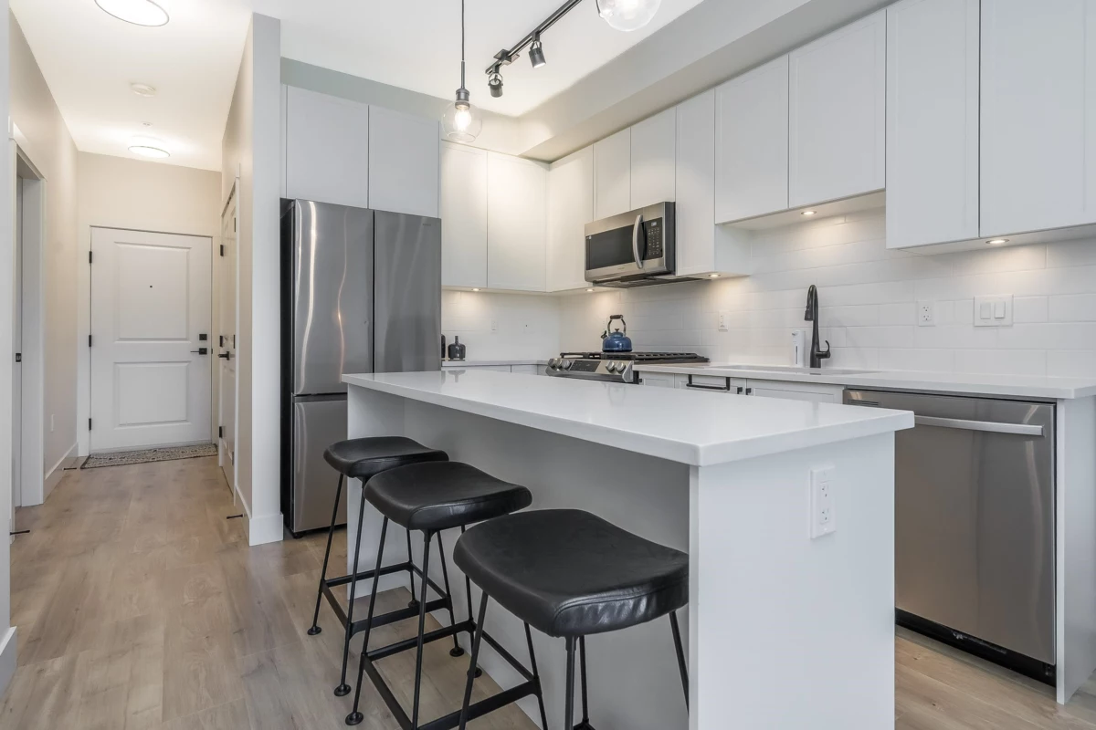 Welcome to The Windsor. This gorgeous condo has been meticulously cared for by the original owners and shows like brand-new. Features 2 bedrooms, 2 full bathrooms, AIR-CONDITIONING with heat pump in all the bedrooms incl. the living room, BALCONY has gas line hookup for BBQ and brand new window screens. The dining and kitchen area is equipped with stainless steel appliances, GAS RANGE with built-in griddle, quartz counters and Blanco kitchen sink. The bathrooms feature modern matte-black Kohler fixtures, Building is PET friendly, EV charger's low strata fee, rentals allowed. Located near Willowbrook mall, Langley Event Centre, schools, parks and bus routes which are just steps away. Balance of comprehensive 2-5-10 warranty included. Don't miss this one!