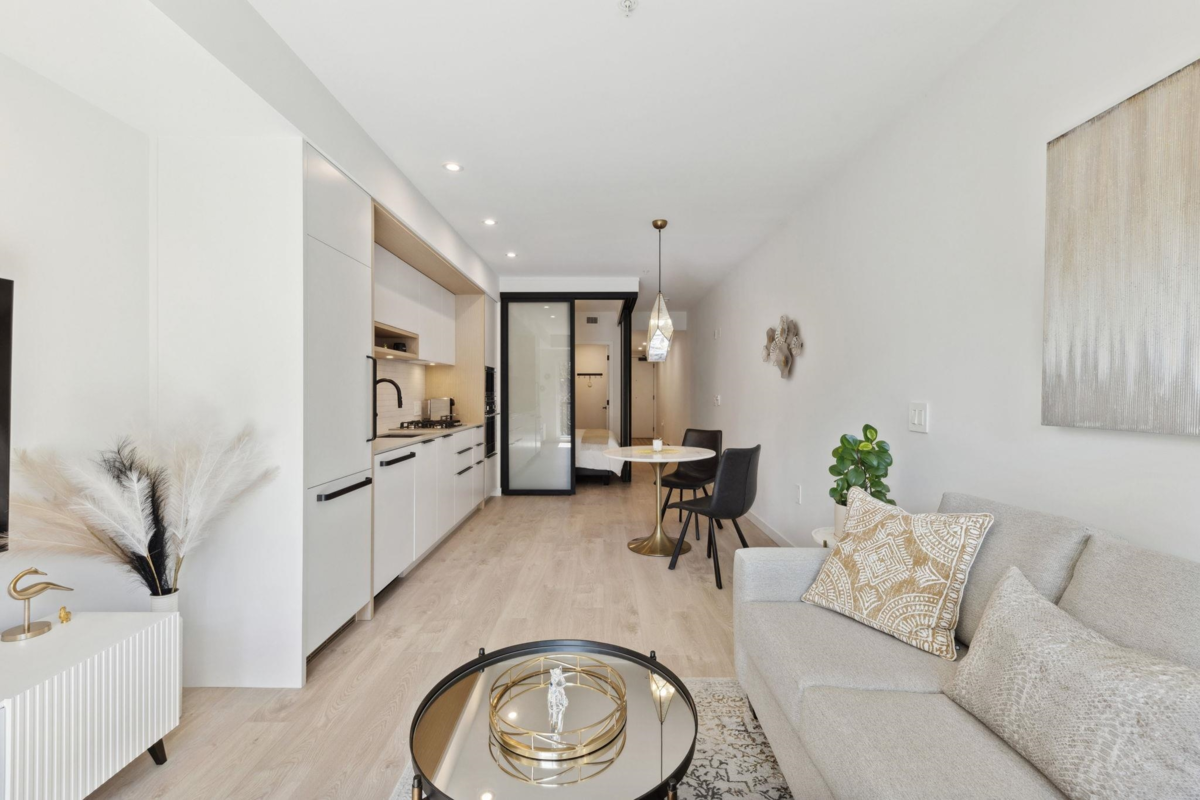 Welcome to a great opportunity to own a designer furnished condo at Habitat, a modern real estate gem located steps from vibrant Main Street and the future Mt. Pleasant Skytrain Station. Featuring laminate flooring, matte cabinetry, Quartz countertops, under cabinet LED lighting, an Italian appliance package, sleek matte black hardware & plumbing fixtures. This urban one-bedroom has a practical layout and is facing the quiet inside street. Building amenities include a stunning rooftop patio with an outdoor kitchen, dining area & fire pit lounge and a beautifully designed amenity room ideal as a workspace. Habitat is surrounded by a creative culture of craft breweries, eclectic cafe, local boutiques and restaurants. 1 parking stall, 2 storage lockers, motorized blind and furniture included.