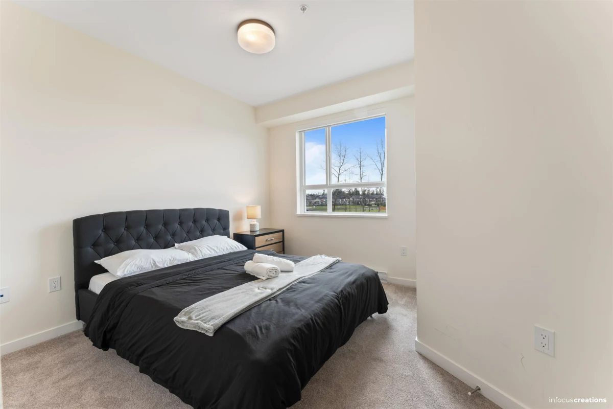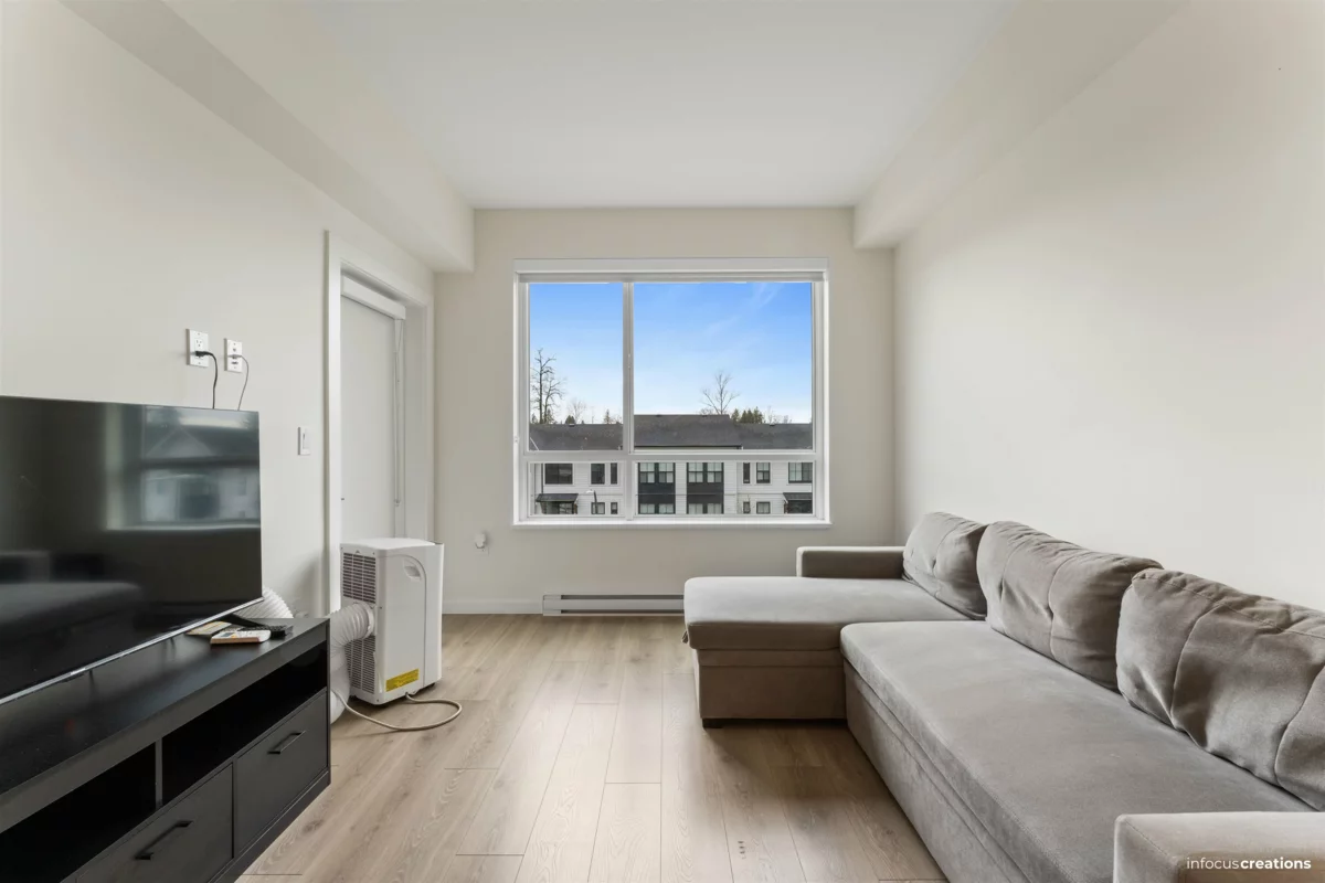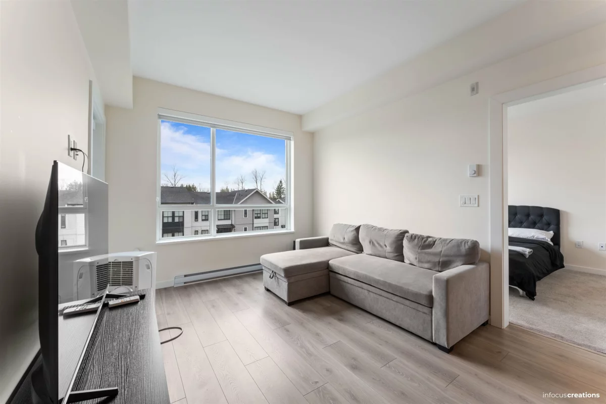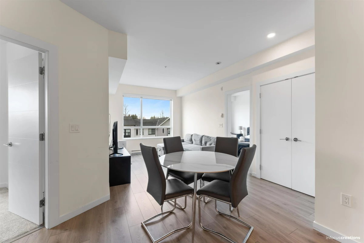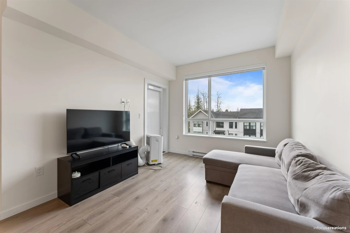 Welcome to this beautiful 2-bedroom + den home in a new 2024-built community in Langley. This 963 sq.ft. third-floor unit offers a bright and well-planned layout with excellent natural light and a quiet, open outlook. The home features a nice contemporary kitchen with modern cabinetry and a functional layout that flow seamlessly into the living and dining areas-perfect for everyday living and entertaining. Enjoy two spacious bedrooms, a versatile den ideal for a home office, and a well-appointed bathroom. Located directly across from an elementary school, this home is perfect for families. Enjoy close proximity to parks, shopping, transit, and major routes, all while living in a newer building. Rare to find 2 Secured Parkings.