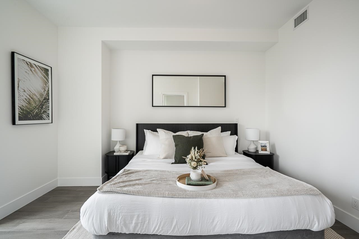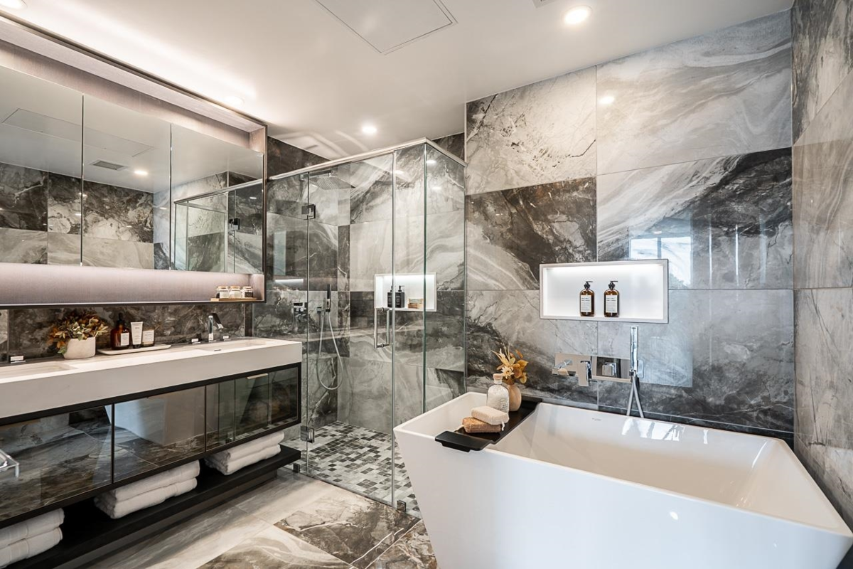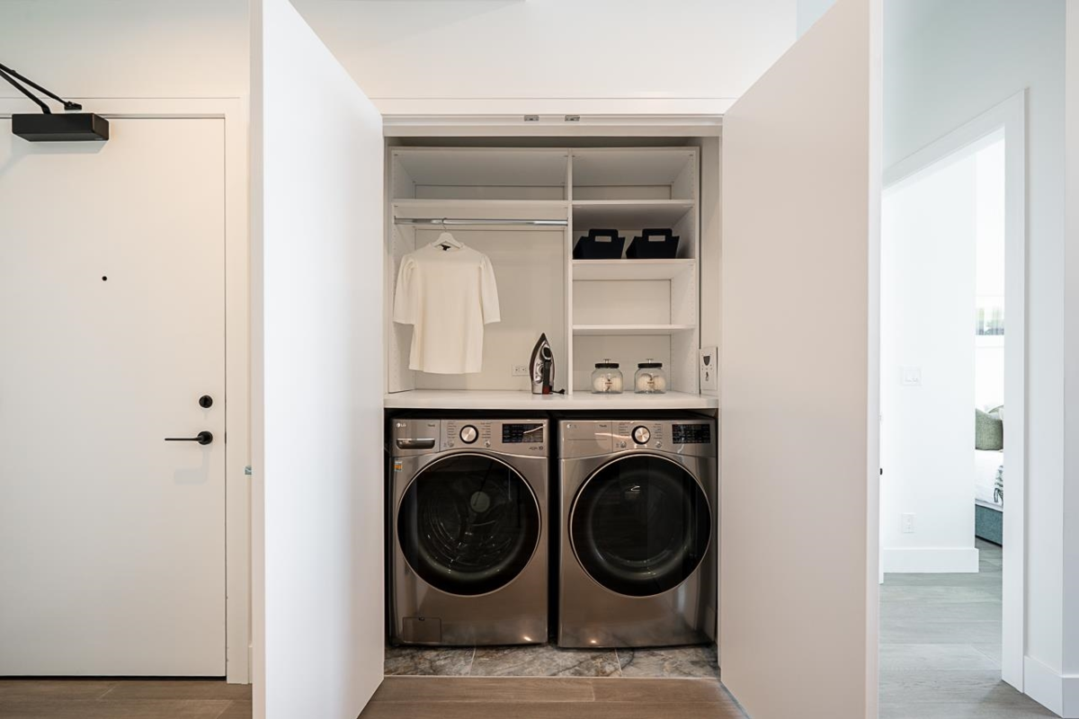 Monaco by Solterra - Elevated living in White Rock. 13 story concrete fully air conditioned, luxury boutique building located just South of Thrift Avenue. Two bedroom plus flex with 2 full bathrooms. Thermador appliances including a 36" fully integrated fridge, wifi enabled convection wall oven, 5 burner gas cooktop, and drawer microwave. Also included is a 24" integrated beverage fridge. Stunning custom kitchen made and designed in Italy and includes a single slab quartz backsplash and quartz hood fan cover. Do you love having a large luxurious ensuite bathroom? This home was made for you! Double vanity, heated tile floors, free standing soaker tub, separate water closet and large stand up shower.