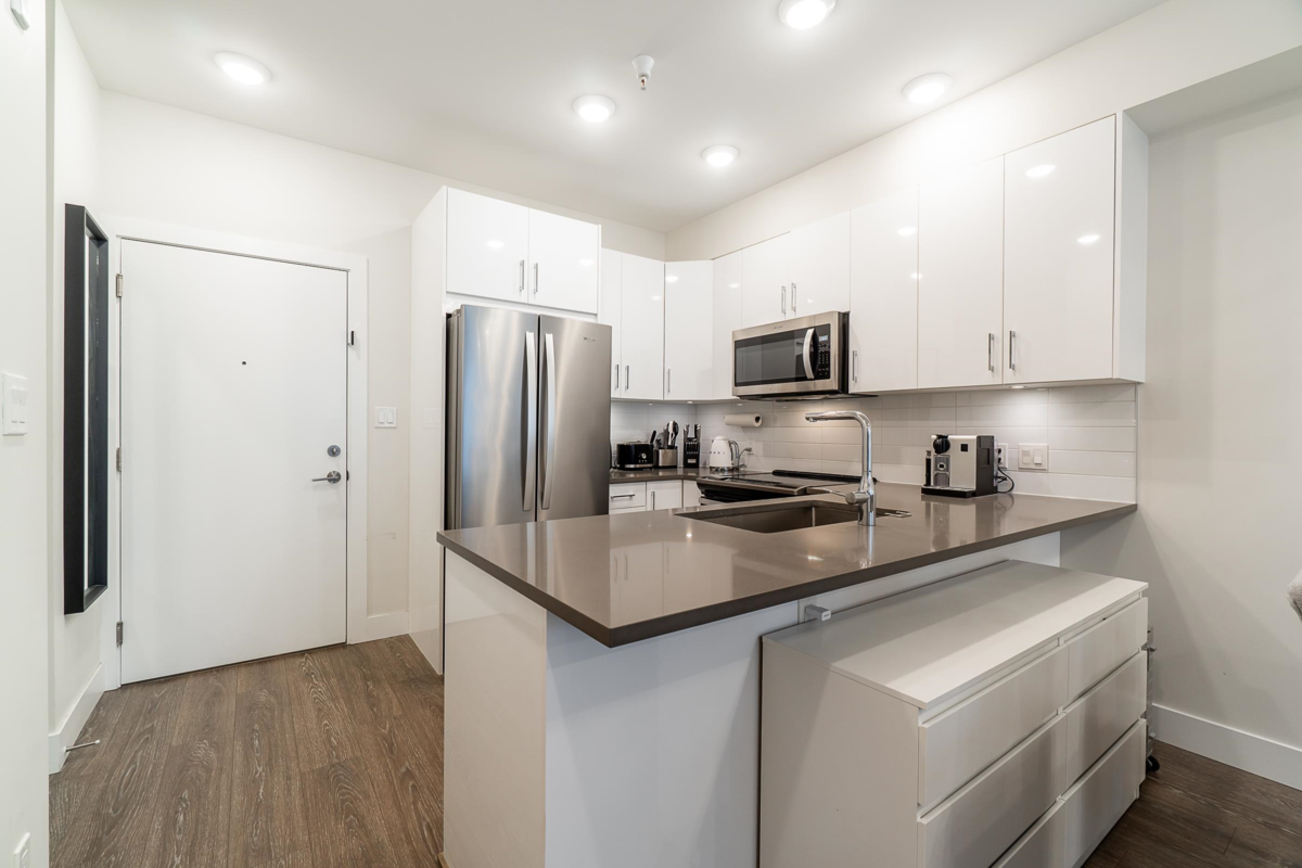 Welcome to The Guildford: A charming 1Bed and 1Bath Condo approx 589 sq.ft. This hidden gem rests in a prime location, nestled in the heart of Surrey. Imagine being just steps away from grocery stores, transits, parks, restaurants, and the Guildford Mall. Open concept floor plan With 9-foot ceilings and generously proportioned extra-large windows, natural light streams in, gives the living spaces in a warm and welcoming glow. The kitchen features S/S appliances and engineered quartz countertops. Delight in the small pleasures of life on your private and cozy patio, the perfect spot for sipping your morning coffee or unwinding after a long day or spend your time using the amenities, which include a gym facility, a fully equipped party room, and a lovely garden. Don't miss out!