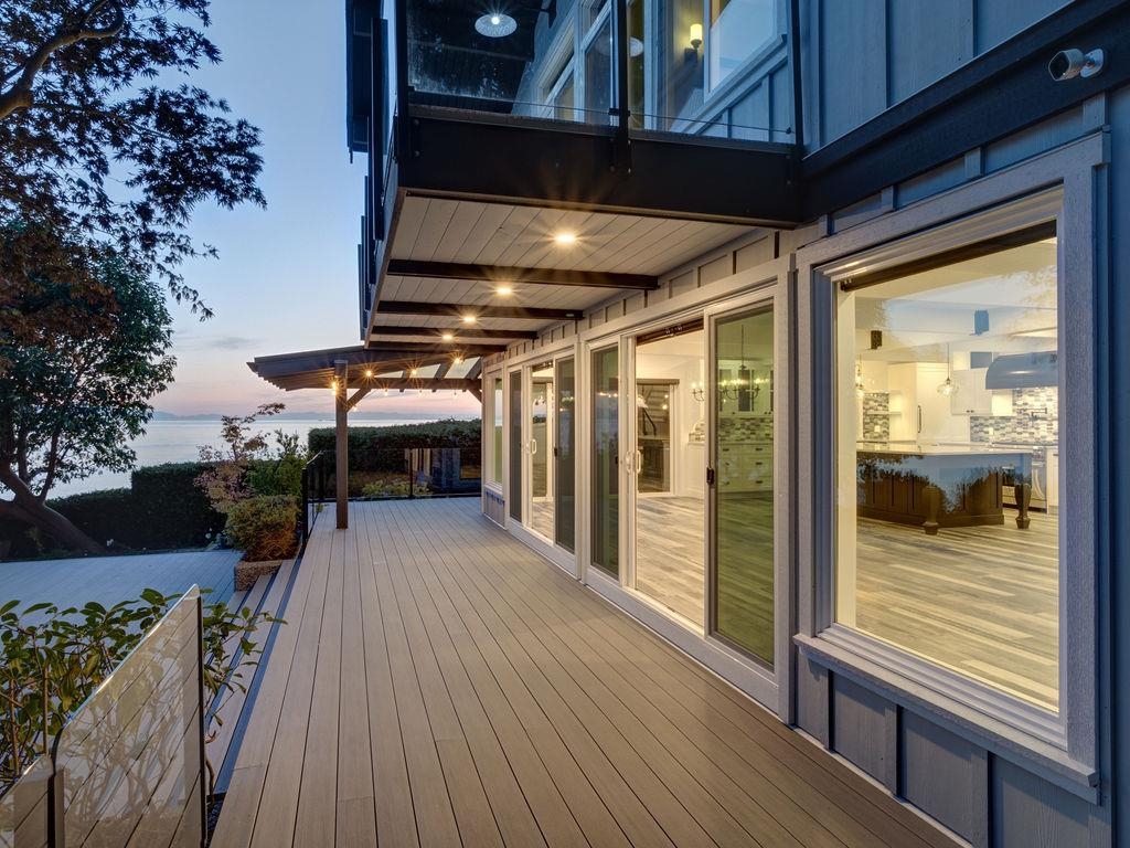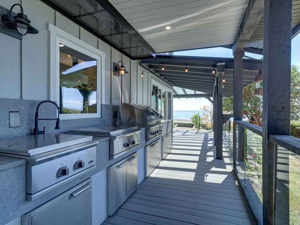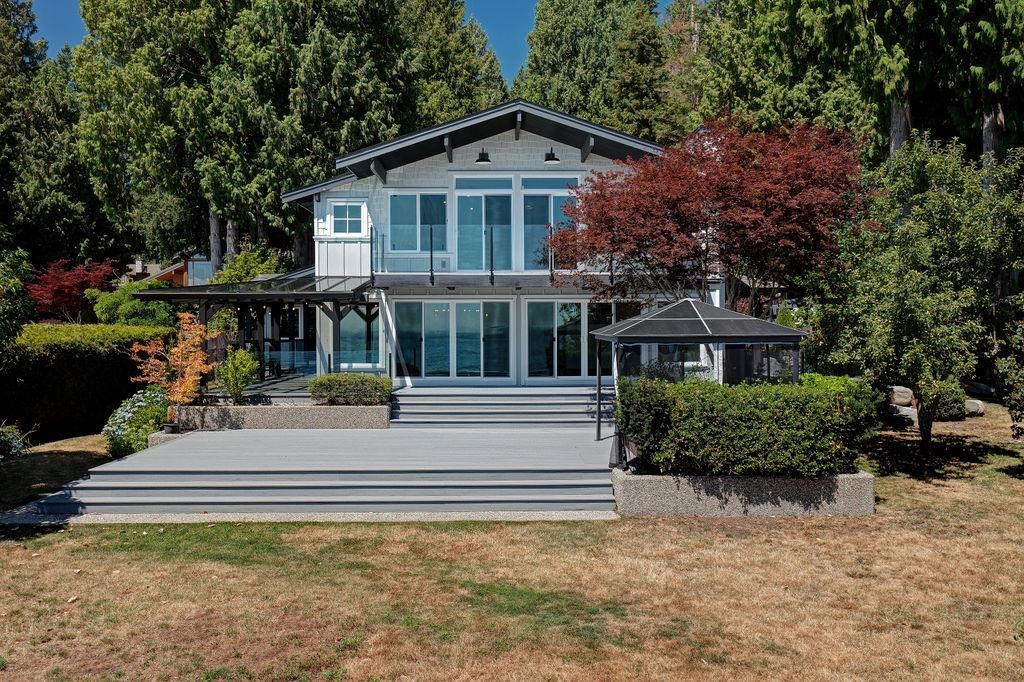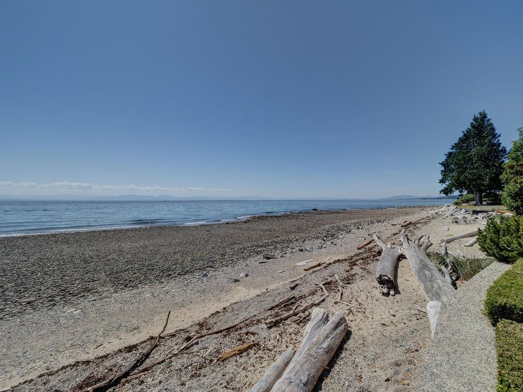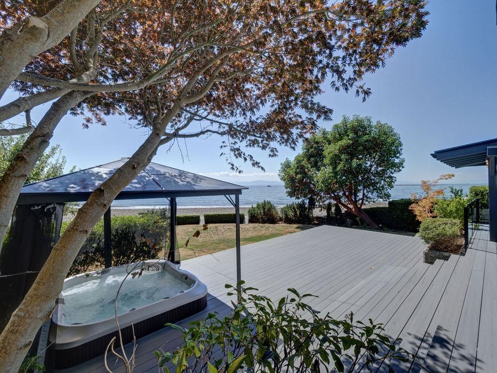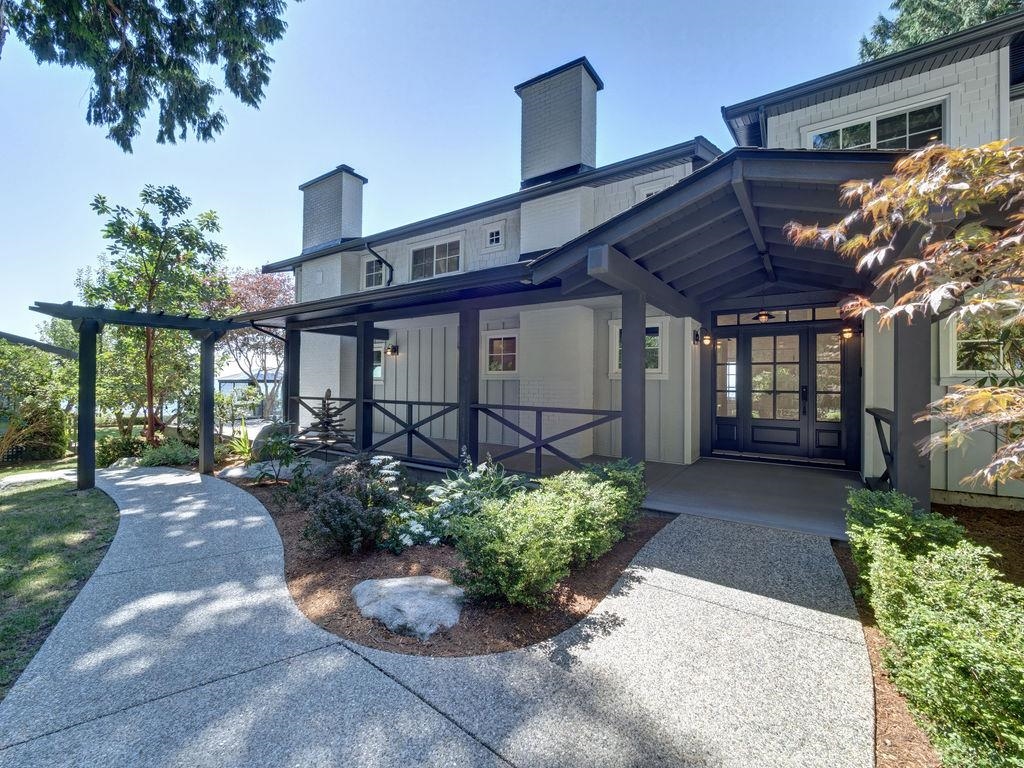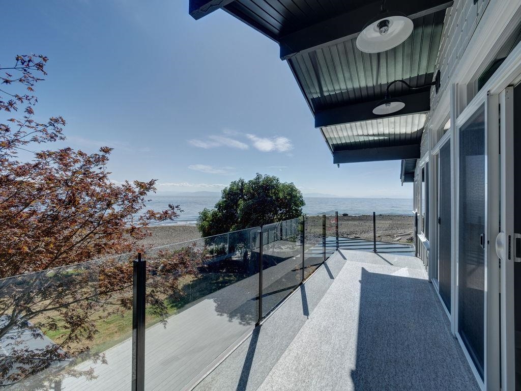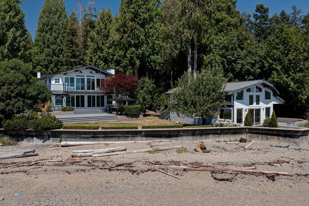 Rare 1.4-acre level walk-out waterfront on Beach Ave with 113 ft of shoreline. Private estate with 2 homes plus a beach studio. Main home (3,745 sq. ft.) fully renovated in 2020 with a chef’s kitchen & butler’s pantry. Floor-to-ceiling windows capture ocean views; all bedrooms have ensuites. Radiant in-floor heat throughout, heat pump with A/C, double garage. Includes 2 bed, 2 bath rancher and waterfront studio. Outdoor living: wrap-around patios, hot tub, workshop, gardens & sunset views. Walk to Gumboot Café & Roberts Creek Pier. Subdivision potential!