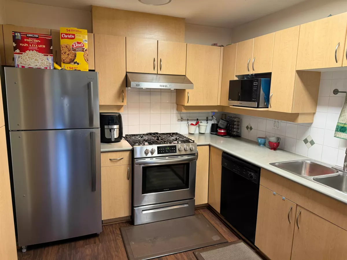 Corner unit townhome offering over 2,300 sq ft of living space. This bright home features 4 bedrooms, 4 bathrooms, a fully finished basement and a private yard. The main living area includes vaulted ceilings and a gas fireplace. The kitchen has a breakfast bar and opens to the family room, making it functional for everyday living and entertaining. Upstairs includes a primary bedroom with ensuite and walk through closet, plus two additional bedrooms. The finished basement offers a fourth bedroom and a large recreation room suitable for a playroom, office, or media space. Large double side-by-side garage. Complex amenities include a children's play area and a community centre.