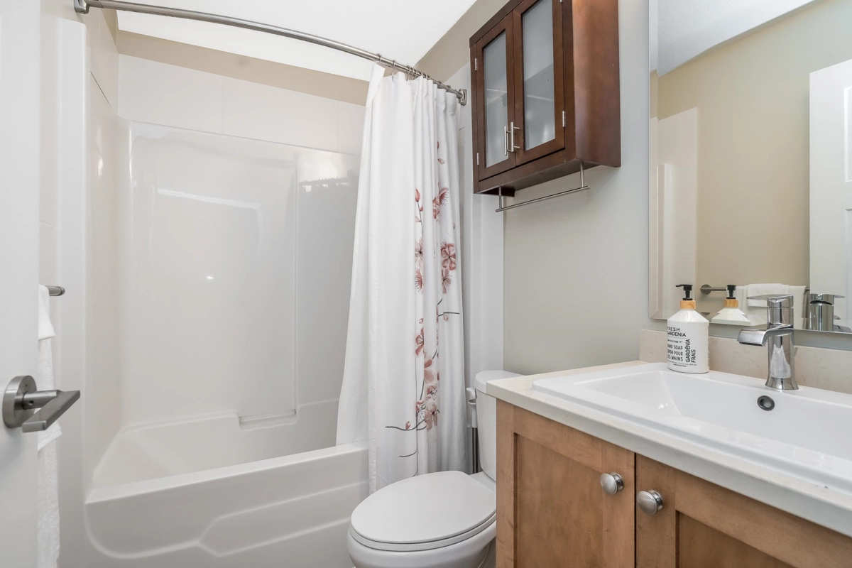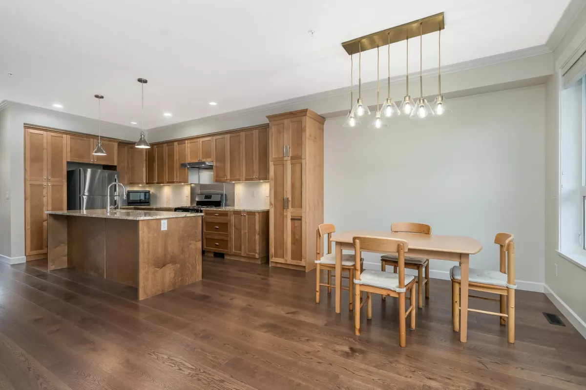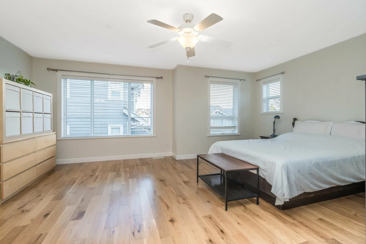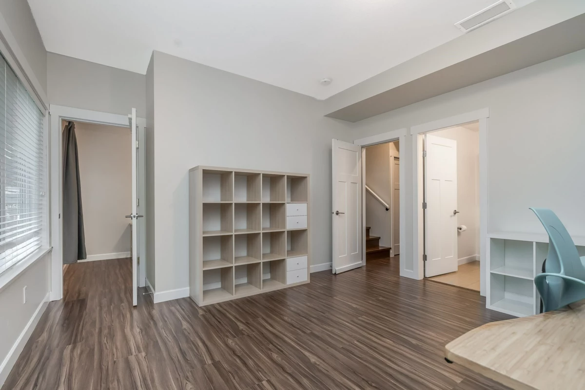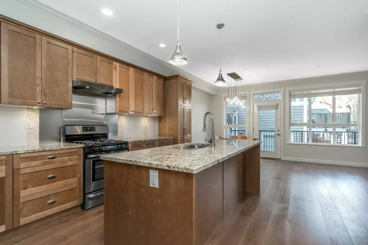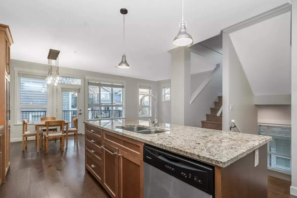 SPOTLESS 4 bed / 4 bath 2381 sq ft CORNER UNIT with side-by-side double garage + 2 pad parking! Flooded with natural light from numerous side windows, but stays cool with AC! Open kitchen w large island (seats 4), shaker cabinets, pantry, granite counters, SS appliances + gas range, & access to a sundeck with morning coffee in the sun. 9’ ceilings, crown moulding, & high-end laminate on the main. Lower level offers a bright rec room with 9’ ceilings, an added bedroom, 3-pc bath, & a walk-out slider to a private backyard, perfect for a teenager or guests. Upstairs features 3 spacious bedrooms, new laundry, & large primary with walk-in closet & 4-pc ensuite with double vanity. Smart home system in place. Visitor parking out front and excellent separation between units provide extra privacy.