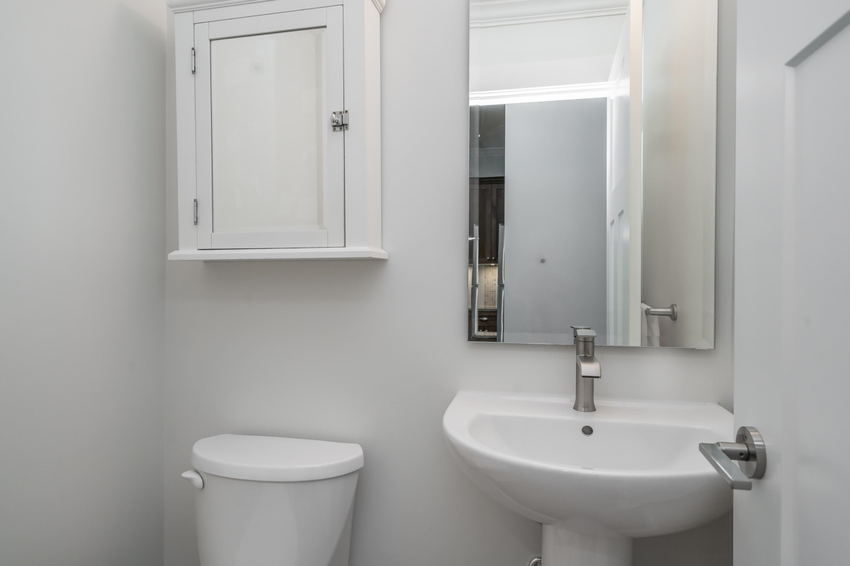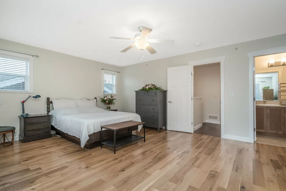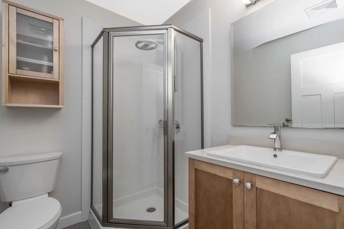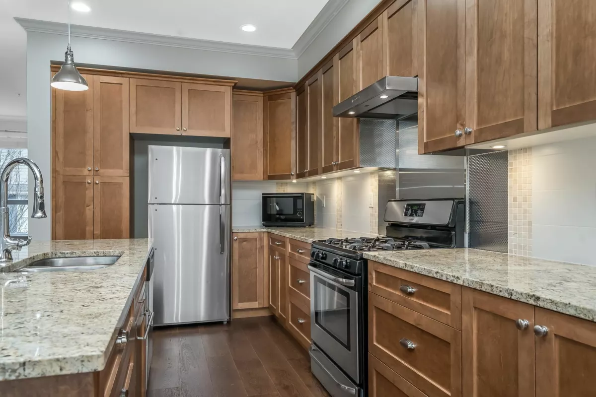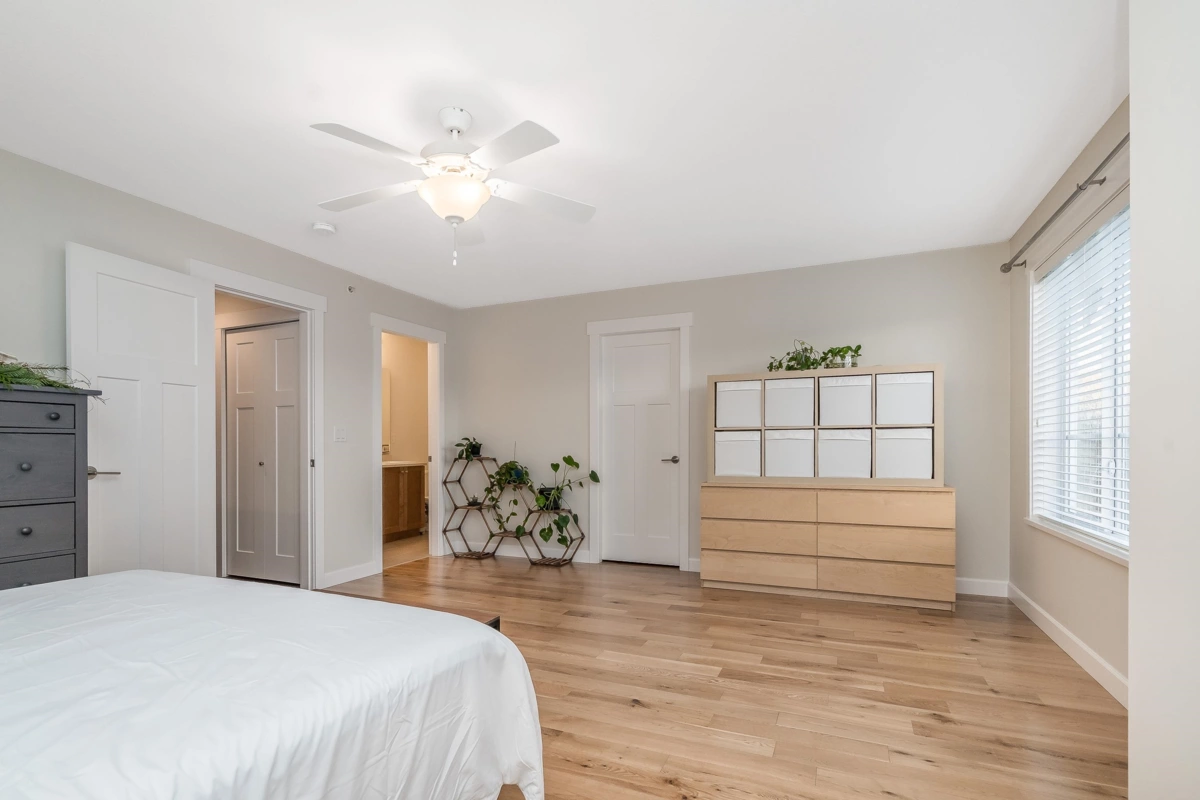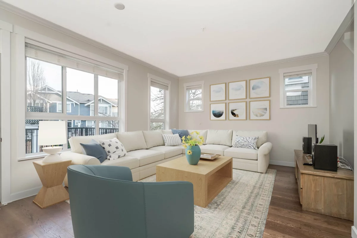 SPOTLESS 4 bed / 4 bath 2381 sq ft CORNER UNIT with side-by-side double garage + 2 pad parking! Flooded with natural light from numerous side windows, but stays cool with AC! Open kitchen w large island (seats 4), shaker cabinets, pantry, granite counters, SS appliances + gas range, & access to a sundeck with morning coffee in the sun. 9’ ceilings, crown moulding, & high-end laminate on the main. Lower level offers a bright rec room with 9’ ceilings, an added bedroom, 3-pc bath, & a walk-out slider to a private backyard, perfect for a teenager or guests. Upstairs features 3 spacious bedrooms, new laundry, & large primary with walk-in closet & 4-pc ensuite with double vanity. Smart home system in place. Visitor parking out front and excellent separation between units provide extra privacy.
