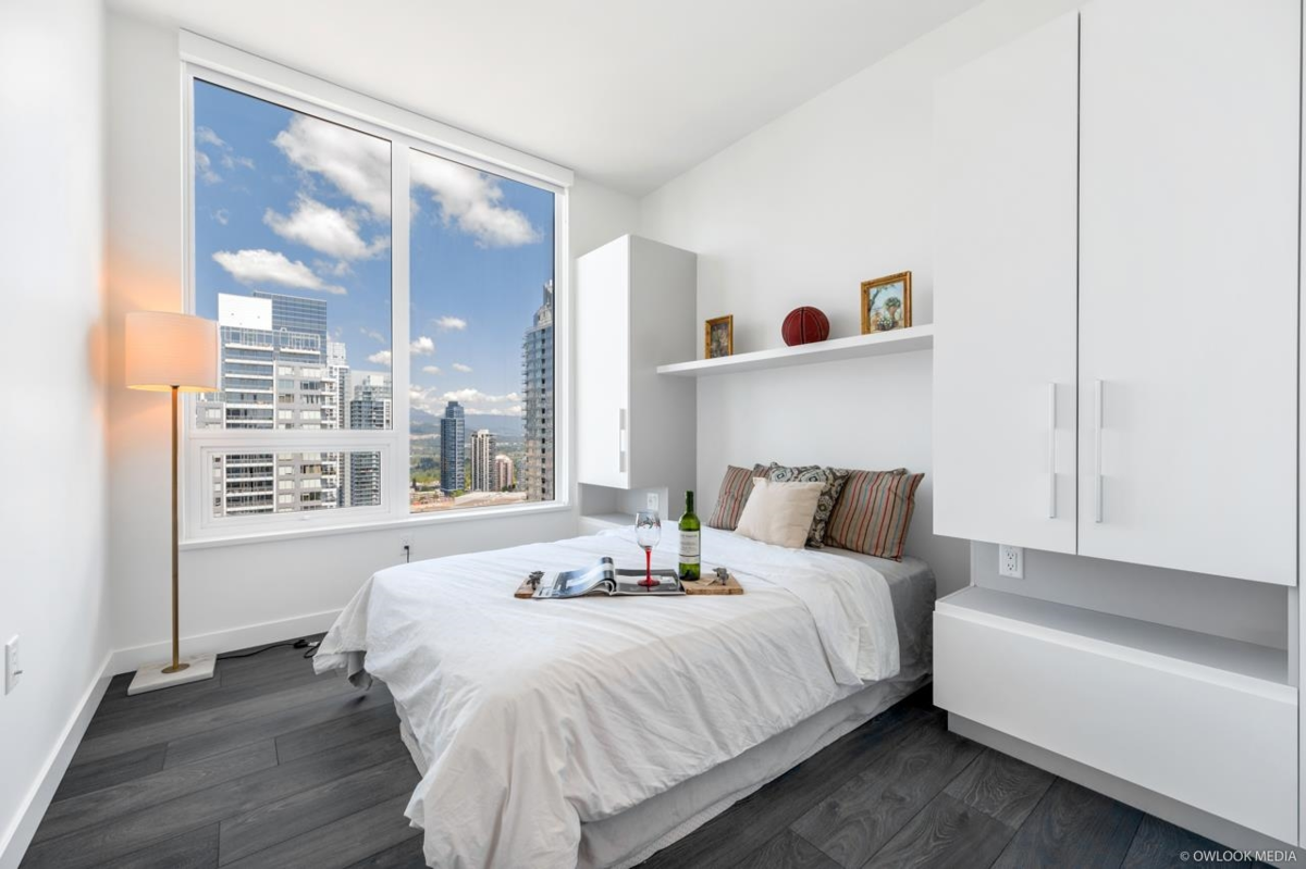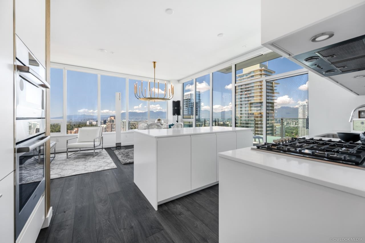 Panoramic view penthouse in Maywood in Metrotown. Located directly north of Maywood Park, Stone throw away from Metrotown shopping mall and the Skytrain station. This 1,264 sqft Penthouse thoughtful upgrade with designer selected wallpaper throughout. Open concept layout, spacious living room, modern kitchen with wifi enable 30" BOSCH appliances. Offers unobstructed views from to downtown and north shoe mountain. Enjoy the fresh air right from central park in your large size balcony> East-north -west facing brings sunshine in the morning and sunset at night. 10 feet high ceiling. Lots of nature light. Amenities : 24-hour concierge, fully equipped fitness studio, expansive lounge area, dog wash, bike repair room and more.Open House: Dec 07, 2025, Sun, 2:00-4:00pm