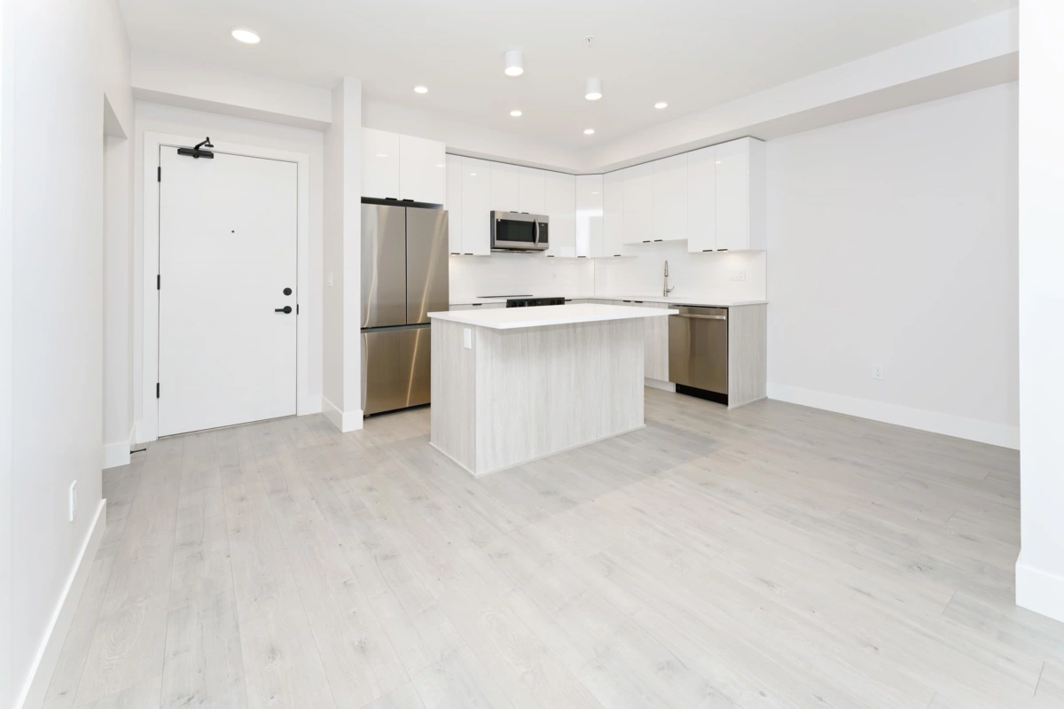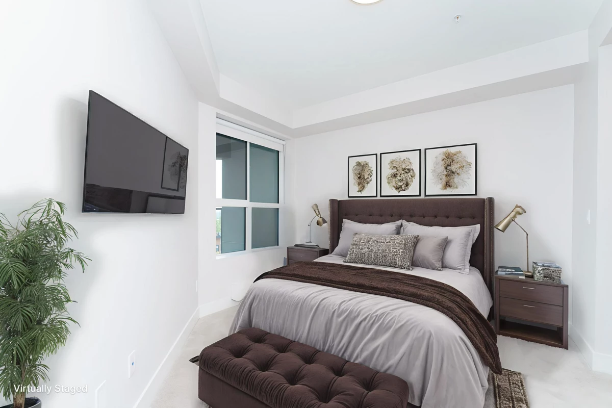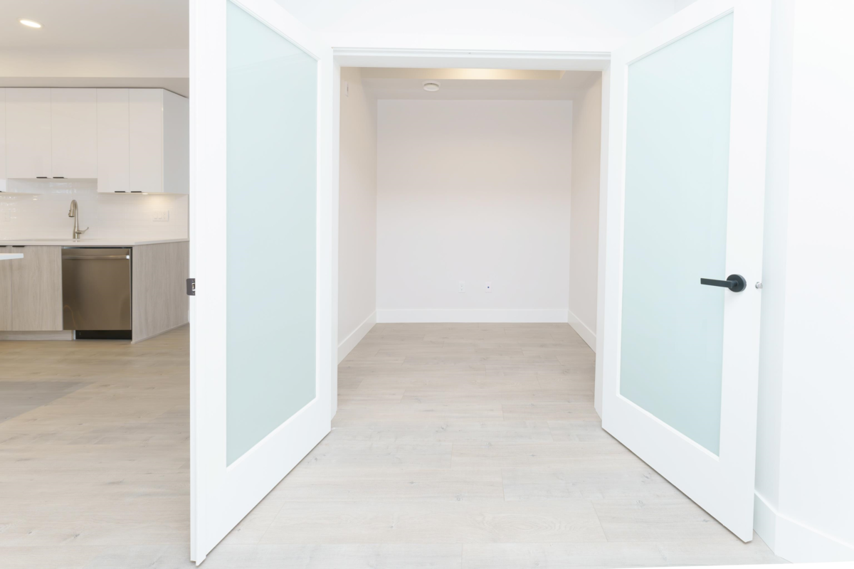 Welcome to Galilea by Whitetail Homes in Surrey City Centre. Ready to move in! This 1 bed plus den, 1 bath home offers a spacious and open layout plus a large East facing covered balcony. The kitchen features modern stainless steel appliances, quartz counters and a large island. It opens to a well-sized dining and living area, perfect for entertaining. The large den is ideal for a home office or guest space. Thoughtful features include a walk-in closet, in-suite laundry, and modern finishings throughout. The building has a gym, wellness center, party room, gardens, a playground and home office hub. Includes 1 parking beside elevator and 1 storage. Walk to SkyTrain, SFU, Surrey Memorial Hospital and Queen Elizabeth Secondary School. Fees include heat and hot water. Photos virtually staged.