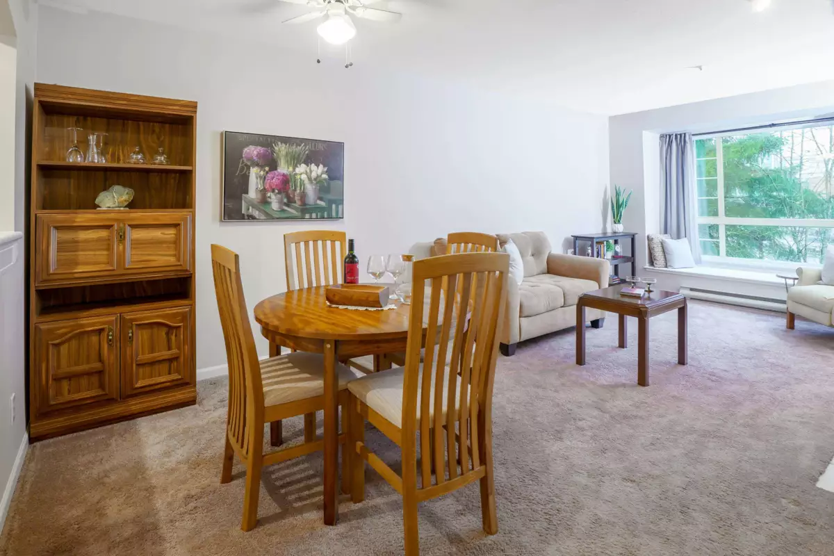Experience serenity and city life in this lovingly maintained LARGE 1-bed sanctuary at The Kennedy. Bathed in natural light, the spacious open floor plan features a large kitchen with stainless steel appliances and an inviting eat-up bar that flows into a massive living and dining area. Cozy up by the gas fireplace or retreat to the oversized bedroom boasting ample closet space and a 4-piece bath. Step outside to your large private balcony or explore the lush trails just steps away. Unbeatable convenience defines this location, walk to Lafarge Lake, the Aquatic Centre, Coquitlam Centre, Douglas, and the SkyTrain for an effortless commute. With a gym this home is a show stopper! Plus 1 parking and a storage locker!