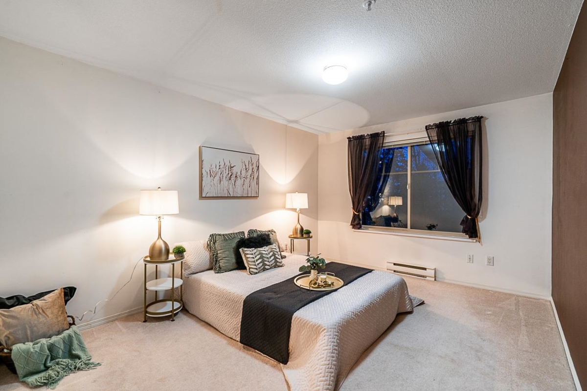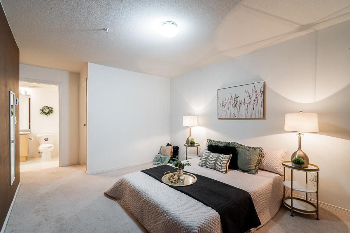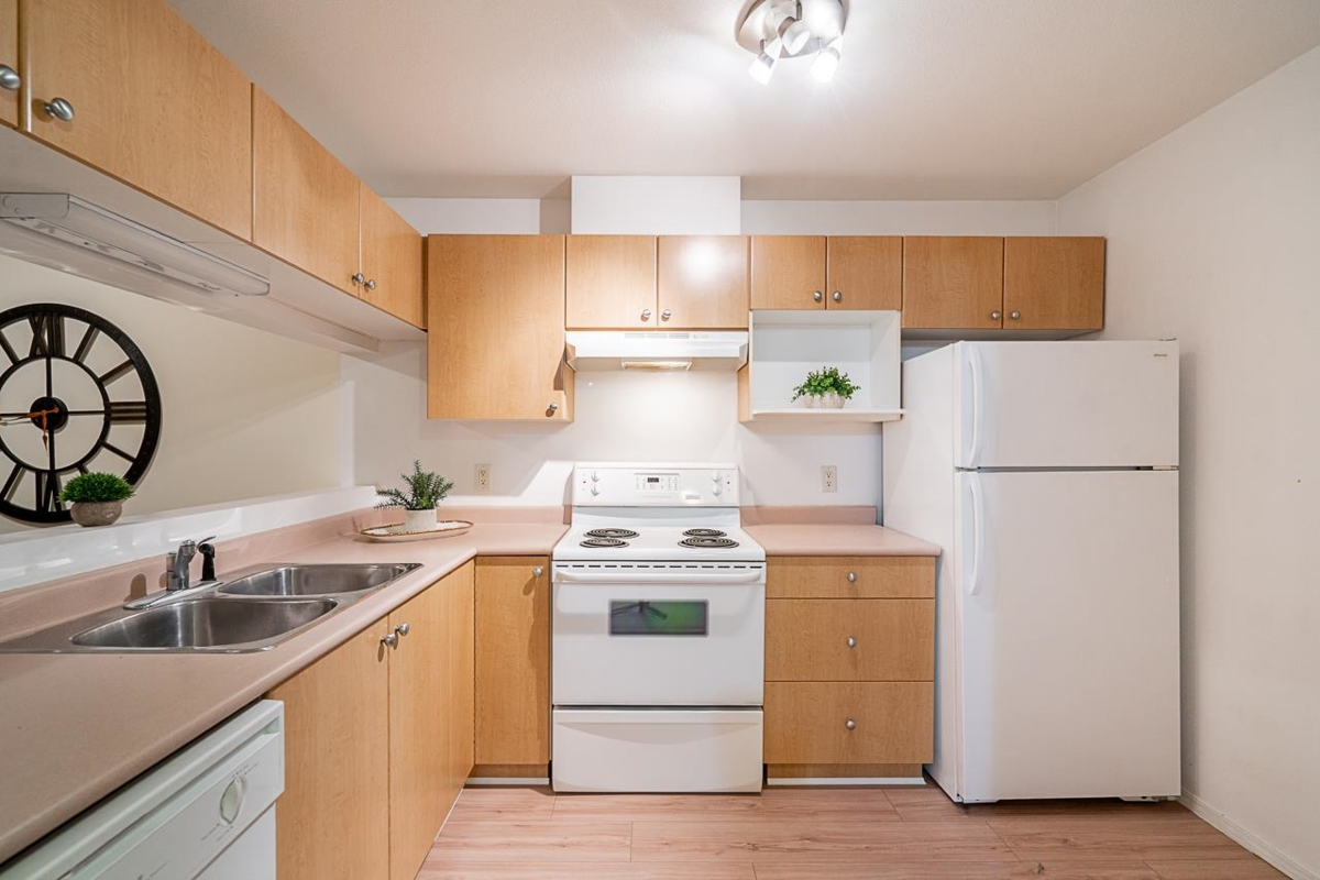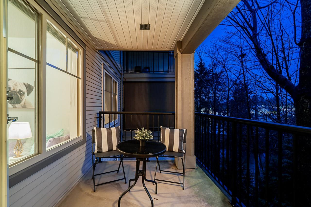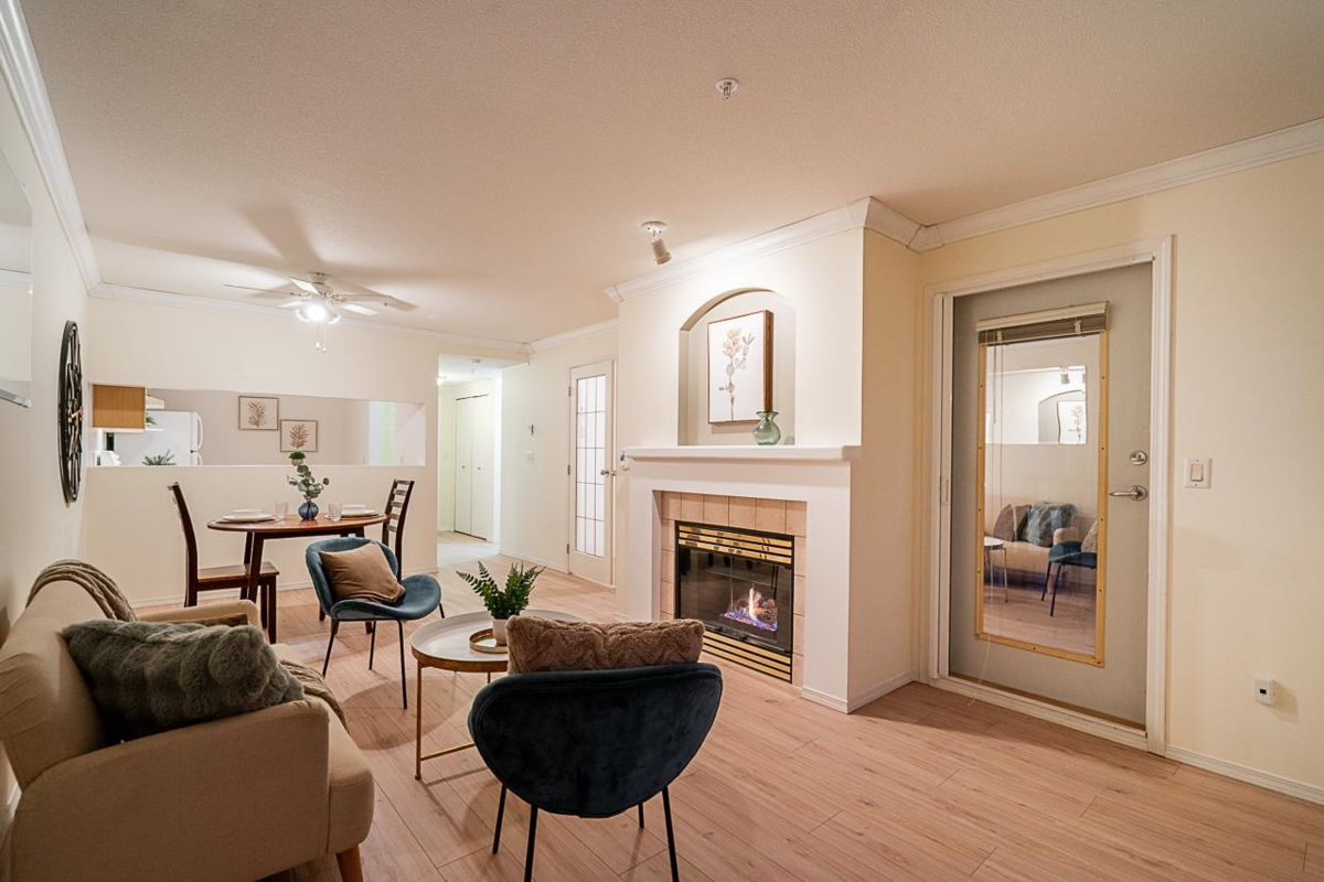 GREENBELT LOCATION. Tucked away in building #3, this condo is located in a peaceful, quiet setting backing onto a lush GREENBELT, perfect for those who value privacy and calm. Enjoy new laminate flooring throughout, a cozy gas fireplace, and a covered balcony ideal for morning coffee or evening downtime. The flexible den can easily function as a second bedroom with the addition of a closet or armoire. Tons of open parking available. Walkable to the new Aldergrove Town Centre. Quick completion dates welcome. STORAGE UNIT IS ON THE SAME FLOOR right across the hall. Great for first time purchasers, Downsizers or investors. Come take a look!