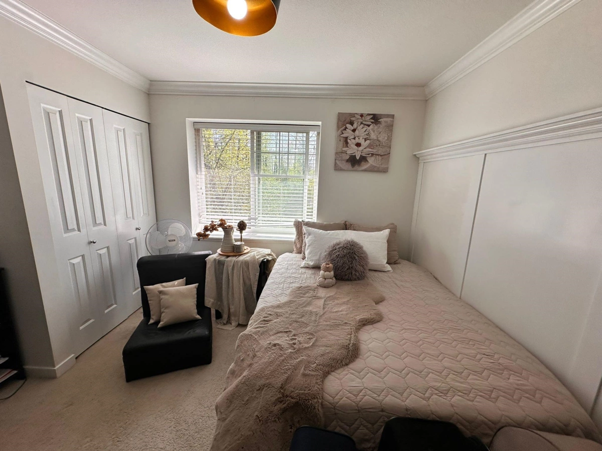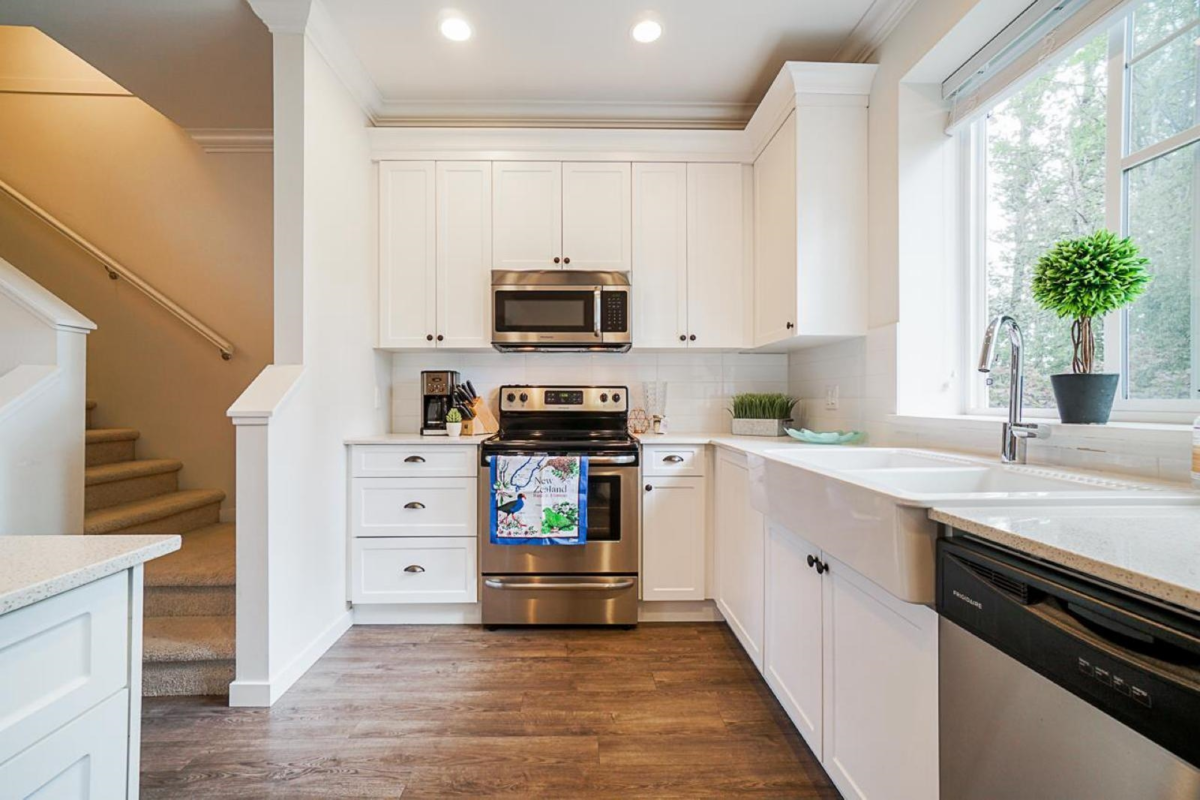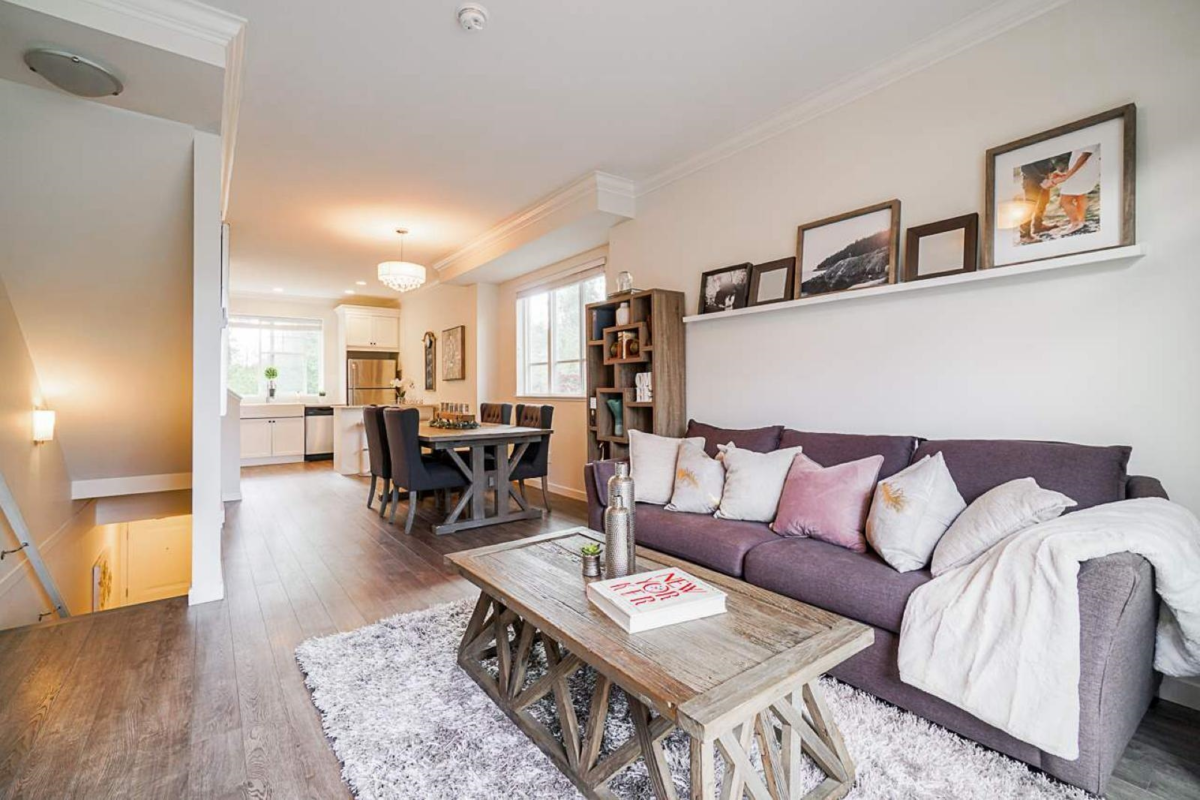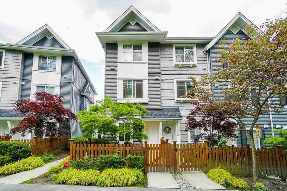 Stylish, Spacious & Affordable. This 3 level, 1188 SF, 2 bed plus den available in the quietest location in town, close to everything yet away from it all. Open main floor w/ Beautiful laminate floors, 9' ceiling, gourmet kitchen w/ quartz counters, soft close cabinets, S/S appliances, new refrigerator in 2022, Elegant dining & living room & a large balcony perfect for BBQs. Downstairs DEN can be rented! Large master bedroom. Top of the shelves wall painting done in entire house in 2022 including garage, Low strata fees, pet friendly & 3 CAR PARKING! This unit offers the largest parking with 1 covered and you can fit 2 vehicles outside tandem. This unit faces the GREENBELT, which is amazing for pets or kids in the family. This will not LAST!