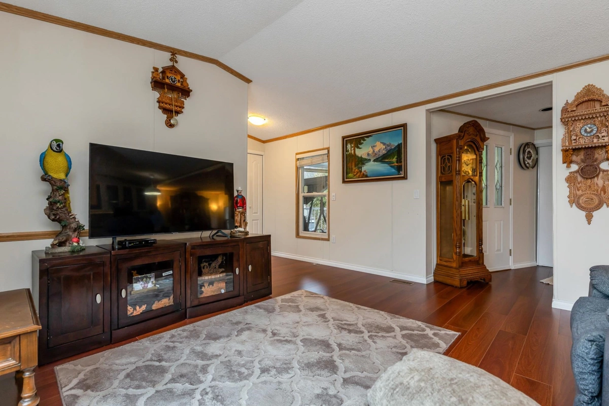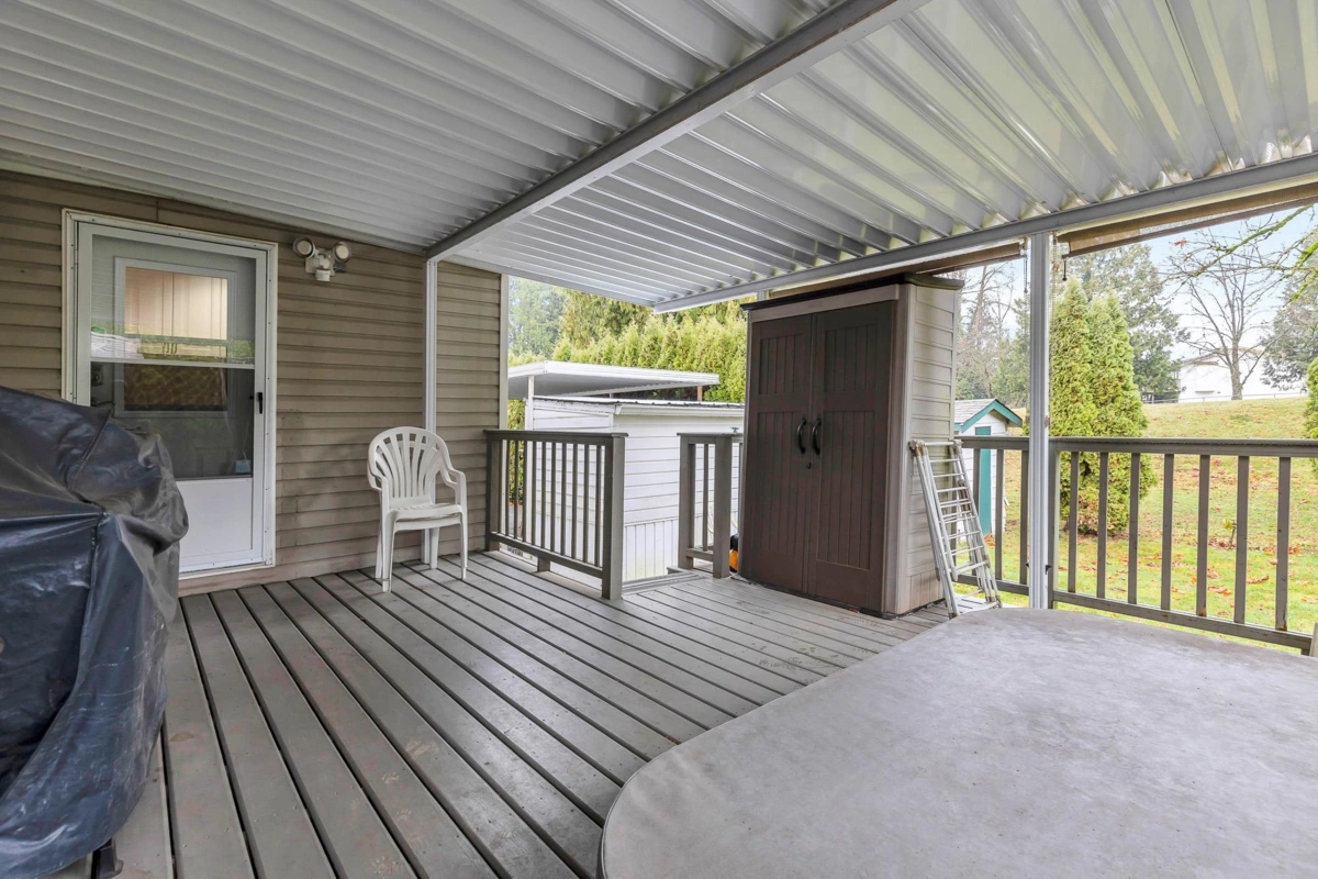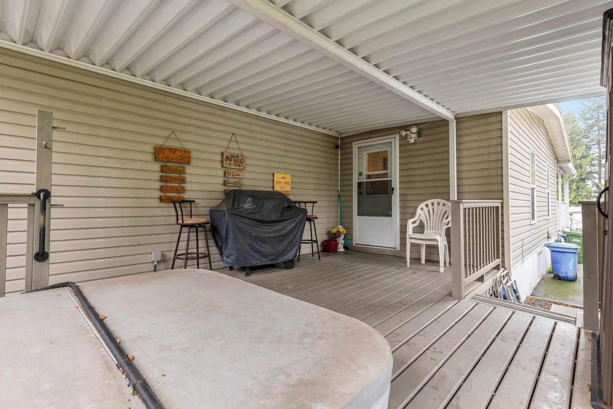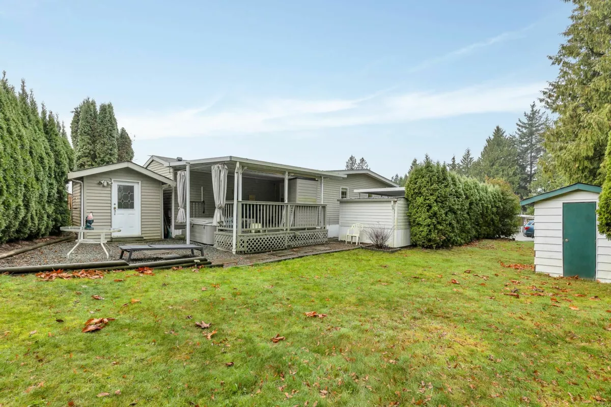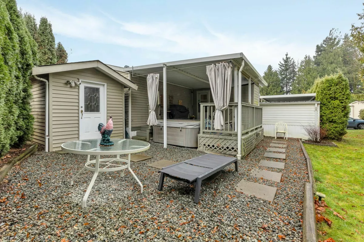 Fantastic home with all the necessities on one level! This spacious home offers over 1,200 sq ft of thoughtfully designed living space with 2 bedrooms and 2 bathrooms. Enjoy the convenience of two covered decks, a relaxing hot tub, air conditioning, and a new hot water tank. The home features a full-size washer and dryer, great kitchen for the cook in the family, built-in storage, and three additional storage sheds outside. Open-concept living area that’s perfect for everyday living and entertaining. The yard is amazing and the location in the park is like no other. You'll have to come and have a look for yourself. All of this makes this the perfect place to call home! Agult oriented 55+ plus age restriction.