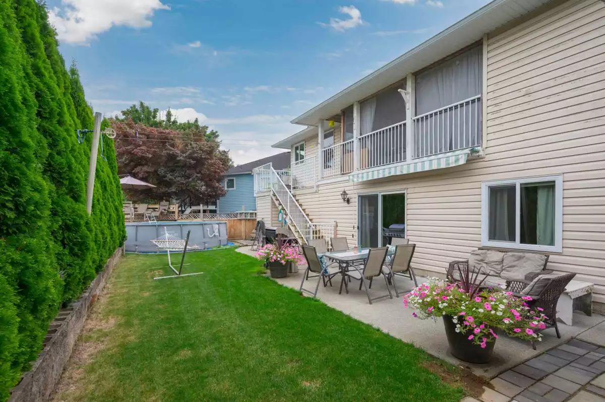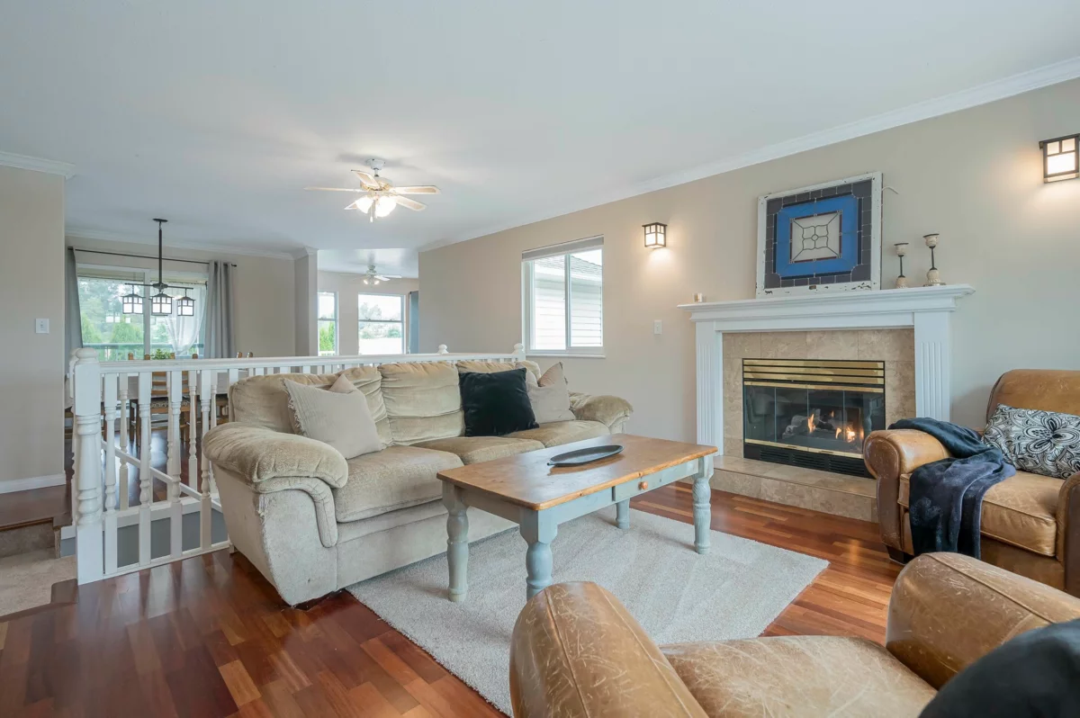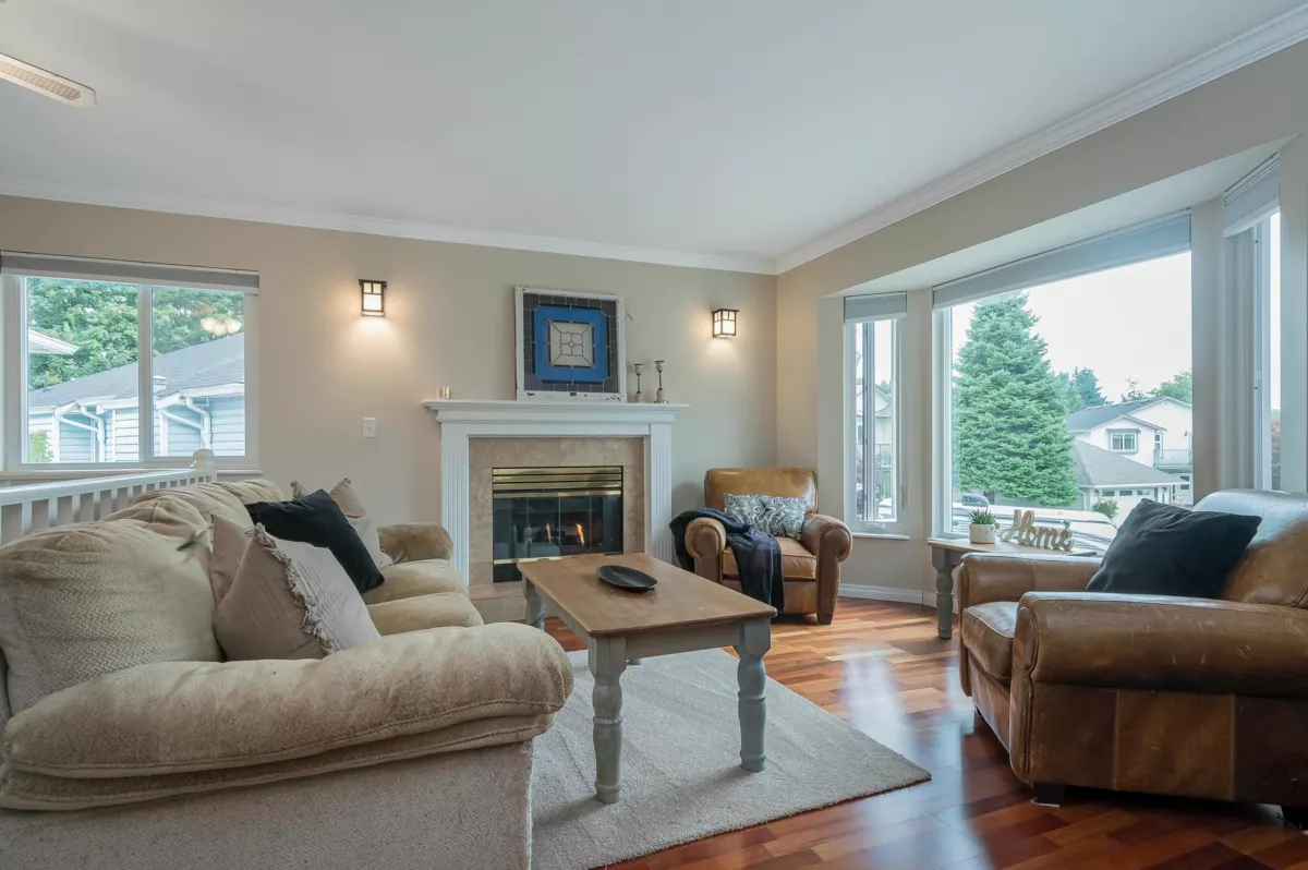 This fantastic sun drenched family home has approx. 2500 sq. ft. of living space. Enjoy the serene views as it backs onto a beautiful greenspace! Tucked away in a desireable neighbourhood, the spacious upper floor offers a primary bedroom, 4 pc. ensuite, walk-in closet, 2 more bedrooms, 5 pc. bath, gas fireplace. Below includes a large 1 bdrm. accommodation, separate side entry, 2nd kitchen, livingroom, 4th bdrm, new 5 piece bathroom. Double garage and a 4 car driveway. Fresh paint, carpets 2025, new large windows, gutters 2021, new DECK vinyl, rails, stairs, Work-shed PLUS a Storage shed. Walk to schools, parks, shops, the new town center., transit and min. to freeway! MAKE IT YOUR OWN! Flexible dates. Move-in ready. Open house Sept. 6, 12-2 / 7th 1-3pm.