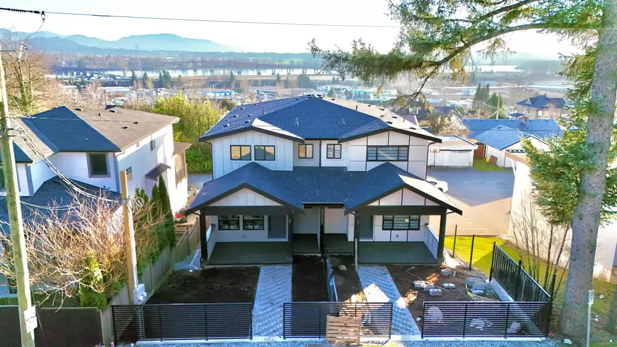 Brand new 5 Bed + Den, 4-bath half duplex in Mission offering over 2,500 sq. ft. of modern living space with no Strata fees. Features an open-concept layout, quality finishes, spacious bedrooms, and abundant natural light. Enjoy panoramic views from two balconies. Main floor includes a bright living area, contemporary kitchen, and a versatile den or guest room. The basement offers a 2-bedroom legal suite with separate laundry and split AC—ideal as a mortgage helper or for extended family. Ample parking, private outdoor space, and a functional layout. Close to schools, shopping, parks, and transit. Some of the PICTURES are virtually staged. Open house on Jan 24,2026 & Jan 25,2026. Timing 2-4 pm