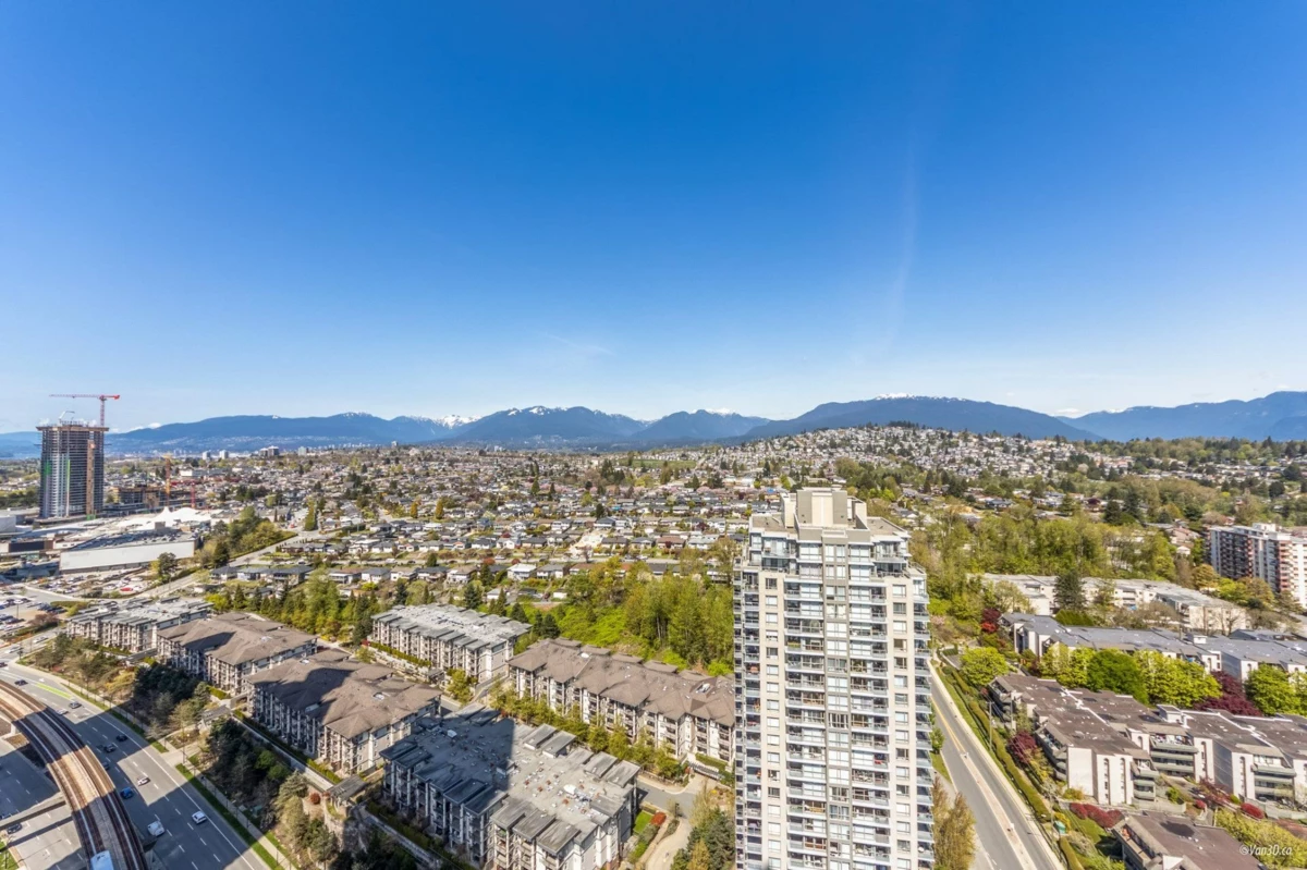 AMAZING VIEWS! Welcome to this luxurious corner 2 bed+den (large enough for a 3rd bedroom), 2 bath home at Hillside East by Concorde Brentwood. Enjoy stunning mountain and city views from your massive 477 SQ FT heated balcony with radiant heaters and LED lighting, offering 1383 SQ FT of indoor/outdoor living. Features include A/C, 24-hour concierge, Bosch kitchen appliances, Resort-style amenities: clubhouse, gym, music room, yoga & ping-pong room, pet grooming, and car wash. Just a 5-minute walk to Brentwood Mall and Skytrain. Measurements by Van3D are approximate, buyer to verify if important. Some pictures are virtually staged to show potential.