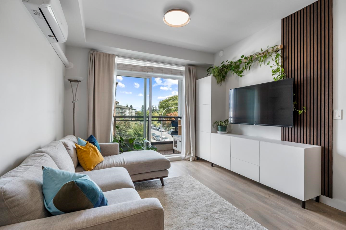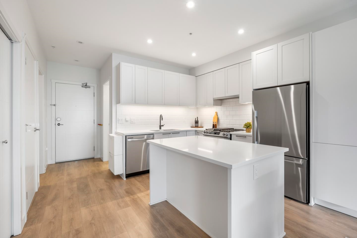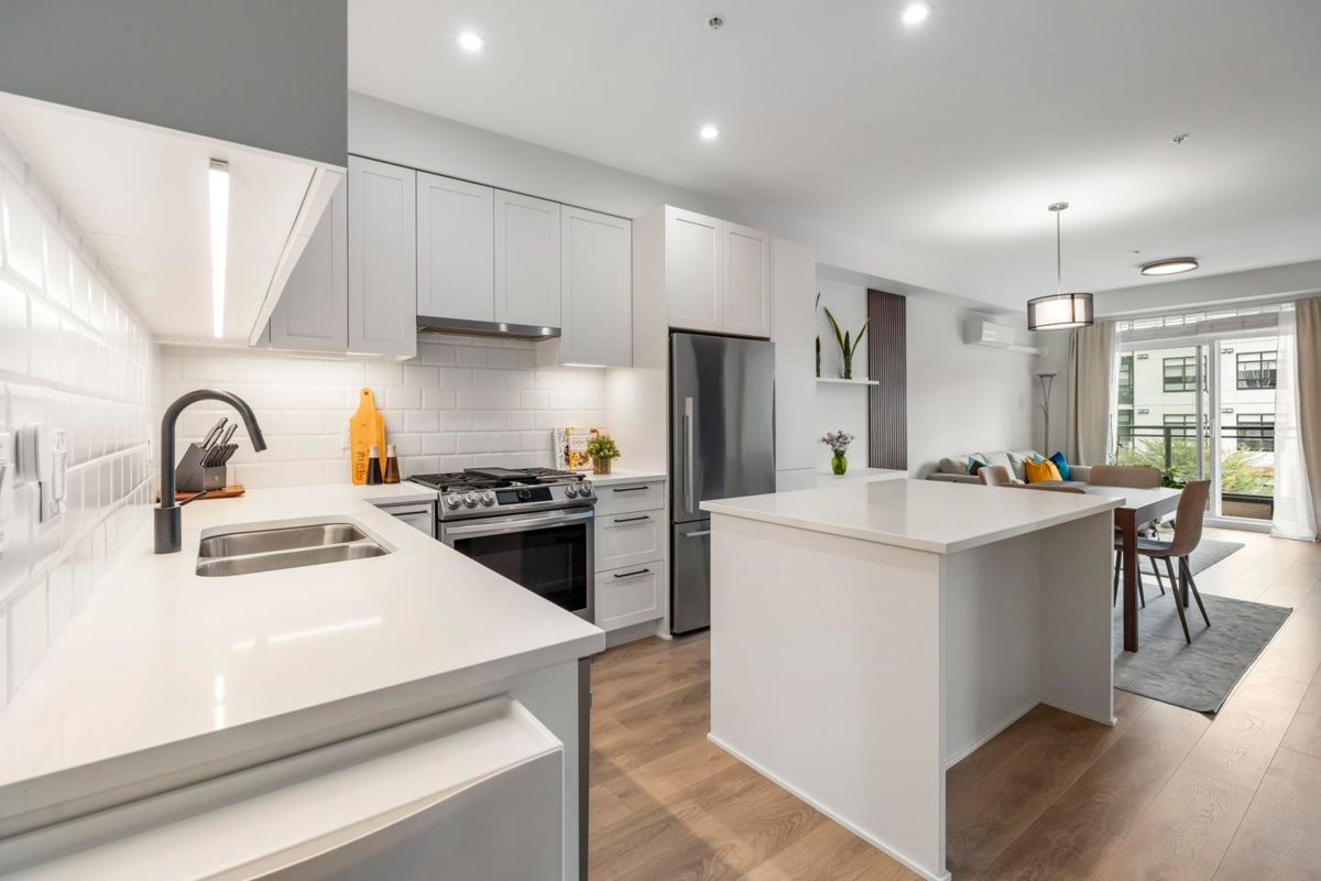 Built by Oaken Developments and backing onto a peaceful greenbelt, this modern 2 BDRM + den, 2 BATH home perfectly balances elegance & everyday comfort. Designed with a smart, open-concept layout, featuring 9’ ceilings, quartz countertops, bar-style kitchen island, premium Fisher & Paykel appliances incl. a Samsung 5-burner gas range. The primary suite offers a luxurious frameless glass shower, double vanity, and walk-in closet. Enjoy A/C, 2 secured parking stalls, and access to resort-style amenities—gym, yoga studio, guest suite, BBQ area, and bike storage. Prime location near schools, places of worship, shopping, dining, parks, Newlands Golf & Country Club, and future SkyTrain access. Built in 2021 and maintained in pristine condition—this home truly offers the best of modern living.