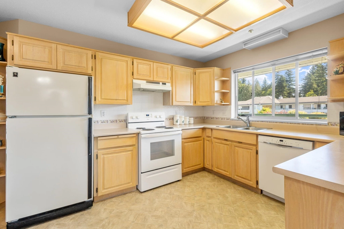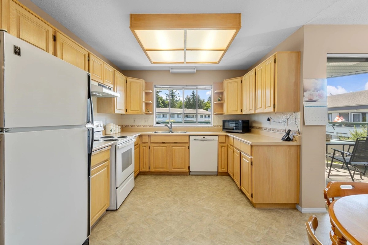 Great opportunity at Centennial Court, 2 bedroom corner unit w/ south & east exposures overlooking the courtyard & landscaped areas. Adult oriented 55+ complex. This bright & spacious condo boasts a huge living room w/ gas fireplace, oversize windows, & adjacent dining room. Large kitchen w/ pantry, cozy eating area, & adjacent family room w/glass sliding doors to private, covered deck. Large master bedroom w/3 piece ensuite, 2nd bedroom, 4 piece main bathroom, & laundry room. Resort-like recreation centre w/ indoor swimming pool, hot tub, lounge area w/kitchen, pool table, exercise centre, & outdoor patio. Guest accommodation for out of town visitors & secure underground parking. Great location across from Mill Lake Park & easy walk to Seven Oaks Mall, recreation, & transit.