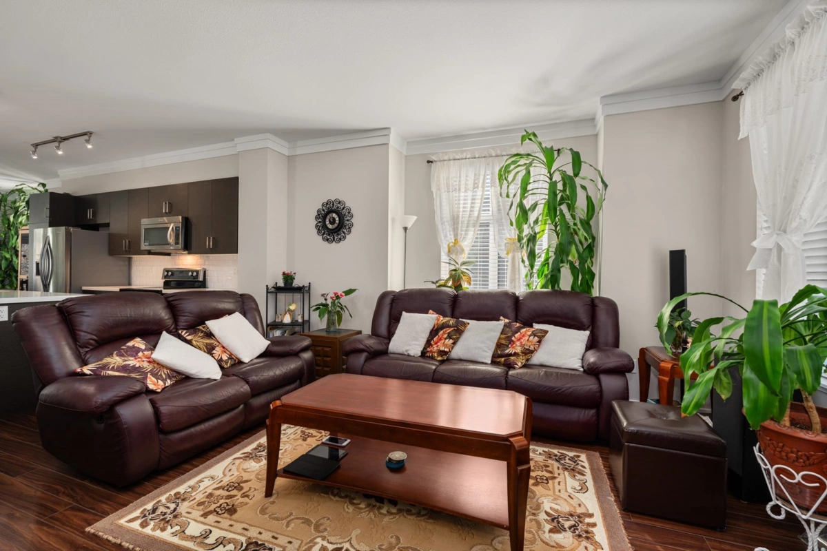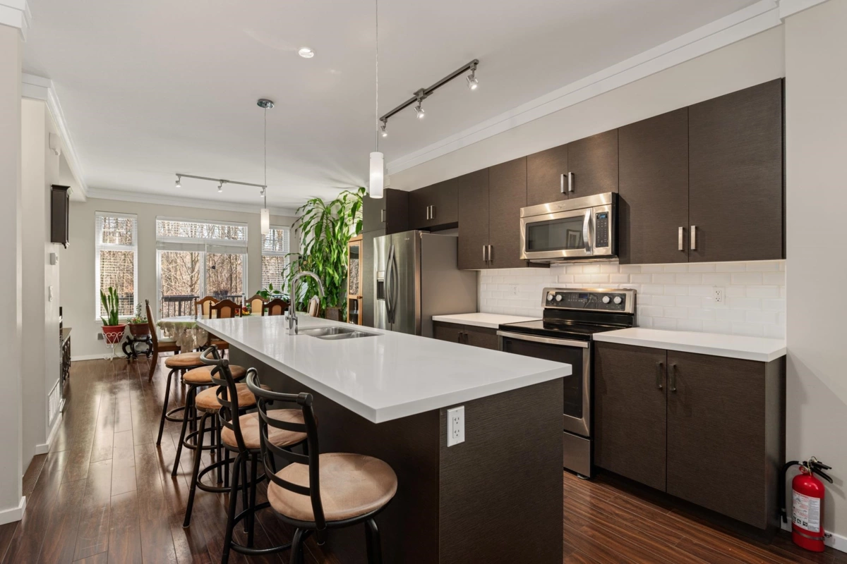 Presenting this end-unit townhouse featuring 3 bedrooms and 3 bathrooms. The bright, open-concept main floor offers 9-foot ceilings, crown mouldings, and is highlighted by a stylish kitchen with quartz countertops, upgraded stainless steel appliances, a large island, a spacious living room, a dining area, a 2-piece powder room, and access to a generous patio. Upstairs, you'll find 3 bedrooms which includes a Master bedroom with a 4-piece bathroom with upgraded clear glass tub enclosure with chrome trim. This home also offers a 2-car tandem garage and backs onto private space. Situated in a prime location near public transit, shopping, dining, recreation, schools of all levels, and more! The complex is also pet and rental-friendly. This is a must-see!